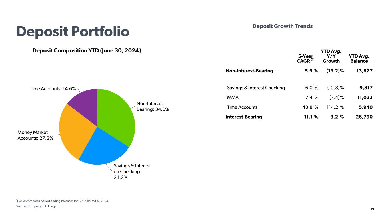 18 Deposit Portfolio • Highly focused on winning customers’ core transactional accounts • Non-interest-bearing averaged 39% of total deposits over the 20 years to 2023 • Goal to drive consistent, balanced growth in deposits and loans • Top quality customer service results in low customer attrition 1 YTD average balances 2 Regional banks defined by membership of the KBW Regional Bank Index as of June 30, 2024 . Peers included where data is available as of June 30, 2024 Source: Company SEC filings $ (B ill io ns ) Non-Interest-Bearing Savings & Interest Checking MMA Time Accounts 2020 2021 2022 2023 Q2-2024 0 5 10 15 20 25 30 35 40 45 50 Blended Cost of Deposits 0.1%0.08%0.05%0.04%0.03%0.07% 0.29%0.38% 0.10%0.04% 0.32% 1.46%1.56% 0.43% 0.31%0.27%0.26%0.27%0.33% 0.55% 0.78% 0.39% 0.14% 3 2.24%2.32% Peer Regional Banks Cullen/Frost 2012 2013 2014 2015 2016 2017 2018 2019 2020 2021 2022 2023 Q-2024 1 3 2 43.1% 26.3% 26.9% 24.2% 27.2% 34.0% 14.6% 3.7%