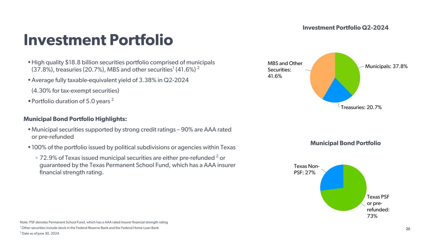 20 Investment Portfolio • High quality $18.8 billion securities portfolio comprised of municipals (37.8%), treasuries (20.7%), MBS and other securities1 (41.6%) 2 • Average fully taxable-equivalent yield of 3.38% in Q2-2024 (4.30% for tax-exempt securities) •Portfolio duration of 5.0 years 2 Municipal Bond Portfolio Highlights: • Municipal securities supported by strong credit ratings – 90% are AAA rated or pre-refunded • 100% of the portfolio issued by political subdivisions or agencies within Texas ◦ 72.9% of Texas issued municipal securities are either pre-refunded 2 or guaranteed by the Texas Permanent School Fund, which has a AAA insurer financial strength rating. Note: PSF denotes Permanent School Fund, which has a AAA rated insurer financial strength rating 1 Other securities include stock in the Federal Reserve Bank and the Federal Home Loan Bank 2 Date as of June 30, 2024 Investment Portfolio Q2-2024 Municipal Bond Portfolio Municipals: 37.8% Treasuries: 20.7% MBS and Other Securities: 41.6% Texas PSF or pre- refunded: 73% Texas Non- PSF: 27%