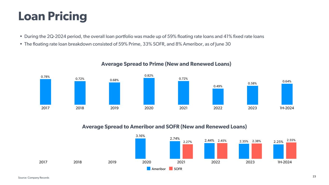 22 Consistent Profitability Over the Cycle • Consistent profitability through Great Recession with no quarterly or annual net loss • History of strong returns on average common equity • The first bank in the nation to turn down TARP bailout funds Return on Average Assets Return on Average Common Equity 1.36% 1.47% 1.63% 1.67% 1.63% 1.51% 1.14% 1.21% 1.17% 1.14% 1.02% 1.05% 0.97% 1.03% 1.17% 1.44% 1.36% 0.85% 0.95% 1.11% 1.19% 1.14% 2003 2004 2005 2006 2007 2008 2009 2010 2011 2012 2013 2014 2015 2016 2017 2018 2019 2020 2021 2022 2023 Q2-24 YTD 17.8% 17.9% 18.8% 18.0% 15.2% 13.1% 9.8% 10.3% 10.0% 10.0% 9.9% 10.5% 9.9% 10.2% 11.8% 14.2% 12.2% 8.1% 10.4% 16.9% 18.7% 16.13% 2003 2004 2005 2006 2007 2008 2009 2010 2011 2012 2013 2014 2015 2016 2017 2018 2019 2020 2021 2022 2023 Q2-24 YTD Source: Company SEC filings