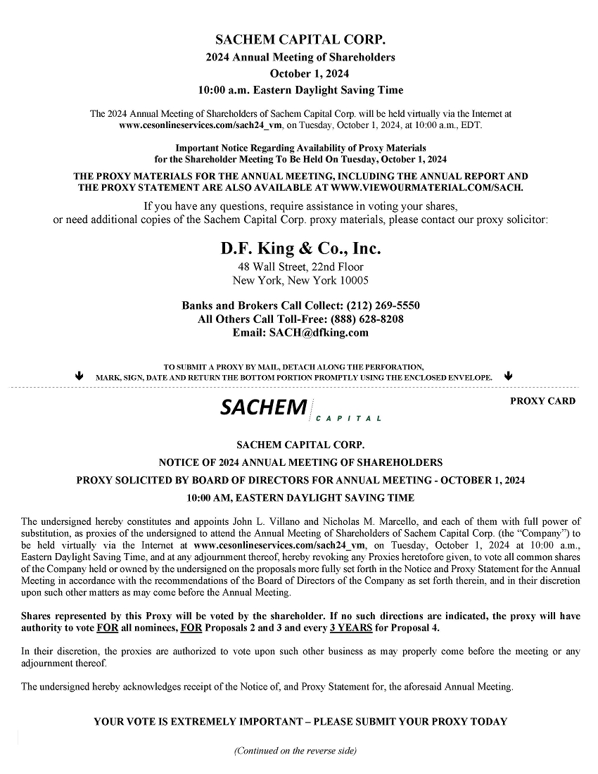 | SACHEM CAPITAL CORP. 2024 Annual Meeting of Shareholders October 1, 2024 10:00 a.m. Eastern Daylight Saving Time The 2024 Annual Meeting of Shareholders of Sachem Capital Corp. will be held virtually via the Internet at www.cesonlineservices.com/sach24_vm, on Tuesday, October 1, 2024, at 10:00 a.m., EDT. Important Notice Regarding Availability of Proxy Materials for the Shareholder Meeting To Be Held On Tuesday, October 1, 2024 THE PROXY MATERIALS FOR THE ANNUAL MEETING, INCLUDING THE ANNUAL REPORT AND THE PROXY STATEMENT ARE ALSO AVAILABLE AT WWW.VIEWOURMATERIAL.COM/SACH. If you have any questions, require assistance in voting your shares, or need additional copies of the Sachem Capital Corp. proxy materials, please contact our proxy solicitor: D.F. King & Co., Inc. 48 Wall Street, 22nd Floor New York, New York 10005 Banks and Brokers Call Collect: (212) 269-5550 All Others Call Toll-Free: (888) 628-8208 Email: SACH@dfking.com SACHEM CAPITAL CORP. NOTICE OF 2024 ANNUAL MEETING OF SHAREHOLDERS PROXY SOLICITED BY BOARD OF DIRECTORS FOR ANNUAL MEETING - OCTOBER 1, 2024 10:00 AM, EASTERN DAYLIGHT SAVING TIME The undersigned hereby constitutes and appoints John L. Villano and Nicholas M. Marcello, and each of them with full power of substitution, as proxies of the undersigned to attend the Annual Meeting of Shareholders of Sachem Capital Corp. (the “Company”) to be held virtually via the Internet at www.cesonlineservices.com/sach24_vm, on Tuesday, October 1, 2024 at 10:00 a.m., Eastern Daylight Saving Time, and at any adjournment thereof, hereby revoking any Proxies heretofore given, to vote all common shares of the Company held or owned by the undersigned on the proposals more fully set forth in the Notice and Proxy Statement for the Annual Meeting in accordance with the recommendations of the Board of Directors of the Company as set forth therein, and in their discretion upon such other matters as may come before the Annual Meeting. Shares represented by this Proxy will be voted by the shareholder. If no such directions are indicated, the proxy will have authority to vote FOR all nominees, FOR Proposals 2 and 3 and every 3 YEARS for Proposal 4. In their discretion, the proxies are authorized to vote upon such other business as may properly come before the meeting or any adjournment thereof. The undersigned hereby acknowledges receipt of the Notice of, and Proxy Statement for, the aforesaid Annual Meeting. YOUR VOTE IS EXTREMELY IMPORTANT – PLEASE SUBMIT YOUR PROXY TODAY (Continued on the reverse side) TO SUBMIT A PROXY BY MAIL, DETACH ALONG THE PERFORATION, MARK, SIGN, DATE AND RETURN THE BOTTOM PORTION PROMPTLY USING THE ENCLOSED ENVELOPE. PROXY CARD |
