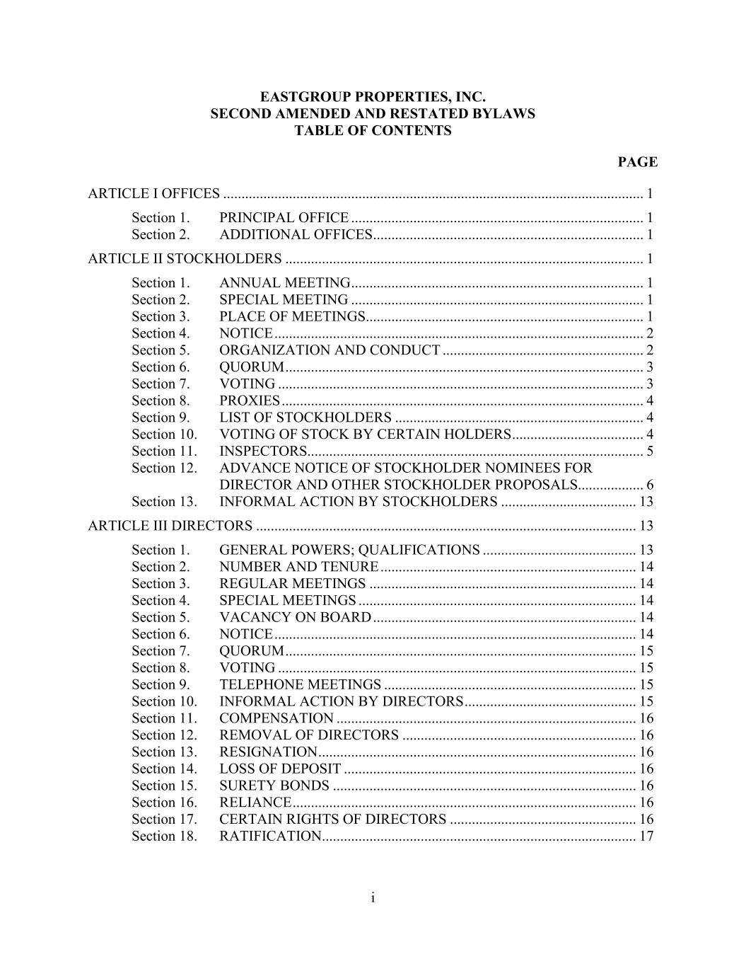 i EASTGROUP PROPERTIES, INC. SECOND AMENDED AND RESTATED BYLAWS TABLE OF CONTENTS PAGE ARTICLE I OFFICES ................................................................................................................... 1 Section 1. PRINCIPAL OFFICE ................................................................................ 1 Section 2. ADDITIONAL OFFICES .......................................................................... 1 ARTICLE II STOCKHOLDERS .................................................................................................. 1 Section 1. ANNUAL MEETING ................................................................................ 1 Section 2. SPECIAL MEETING ................................................................................ 1 Section 3. PLACE OF MEETINGS............................................................................ 1 Section 4. NOTICE ..................................................................................................... 2 Section 5. ORGANIZATION AND CONDUCT ....................................................... 2 Section 6. QUORUM .................................................................................................. 3 Section 7. VOTING .................................................................................................... 3 Section 8. PROXIES ................................................................................................... 4 Section 9. LIST OF STOCKHOLDERS .................................................................... 4 Section 10. VOTING OF STOCK BY CERTAIN HOLDERS .................................... 4 Section 11. INSPECTORS............................................................................................ 5 Section 12. ADVANCE NOTICE OF STOCKHOLDER NOMINEES FOR DIRECTOR AND OTHER STOCKHOLDER PROPOSALS.................. 6 Section 13. INFORMAL ACTION BY STOCKHOLDERS ..................................... 13 ARTICLE III DIRECTORS ........................................................................................................ 13 Section 1. GENERAL POWERS; QUALIFICATIONS .......................................... 13 Section 2. NUMBER AND TENURE ...................................................................... 14 Section 3. REGULAR MEETINGS ......................................................................... 14 Section 4. SPECIAL MEETINGS ............................................................................ 14 Section 5. VACANCY ON BOARD ........................................................................ 14 Section 6. NOTICE ................................................................................................... 14 Section 7. QUORUM ................................................................................................ 15 Section 8. VOTING .................................................................................................. 15 Section 9. TELEPHONE MEETINGS ..................................................................... 15 Section 10. INFORMAL ACTION BY DIRECTORS ............................................... 15 Section 11. COMPENSATION .................................................................................. 16 Section 12. REMOVAL OF DIRECTORS ................................................................ 16 Section 13. RESIGNATION ....................................................................................... 16 Section 14. LOSS OF DEPOSIT ................................................................................ 16 Section 15. SURETY BONDS ................................................................................... 16 Section 16. RELIANCE .............................................................................................. 16 Section 17. CERTAIN RIGHTS OF DIRECTORS ................................................... 16 Section 18. RATIFICATION...................................................................................... 17