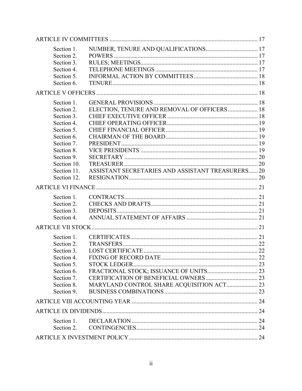 ii ARTICLE IV COMMITTEES .................................................................................................... 17 Section 1. NUMBER, TENURE AND QUALIFICATIONS ................................... 17 Section 2. POWERS ................................................................................................. 17 Section 3. RULES; MEETINGS............................................................................... 17 Section 4. TELEPHONE MEETINGS ..................................................................... 17 Section 5. INFORMAL ACTION BY COMMITTEES ........................................... 18 Section 6. TENURE .................................................................................................. 18 ARTICLE V OFFICERS ............................................................................................................. 18 Section 1. GENERAL PROVISIONS ...................................................................... 18 Section 2. ELECTION, TENURE AND REMOVAL OF OFFICERS .................... 18 Section 3. CHIEF EXECUTIVE OFFICER ............................................................. 18 Section 4. CHIEF OPERATING OFFICER ............................................................. 19 Section 5. CHIEF FINANCIAL OFFICER .............................................................. 19 Section 6. CHAIRMAN OF THE BOARD .............................................................. 19 Section 7. PRESIDENT ............................................................................................ 19 Section 8. VICE PRESIDENTS ............................................................................... 19 Section 9. SECRETARY .......................................................................................... 20 Section 10. TREASURER .......................................................................................... 20 Section 11. ASSISTANT SECRETARIES AND ASSISTANT TREASURERS ...... 20 Section 12. RESIGNATION ....................................................................................... 20 ARTICLE VI FINANCE ............................................................................................................. 21 Section 1. CONTRACTS .......................................................................................... 21 Section 2. CHECKS AND DRAFTS ........................................................................ 21 Section 3. DEPOSITS ............................................................................................... 21 Section 4. ANNUAL STATEMENT OF AFFAIRS ................................................ 21 ARTICLE VII STOCK ................................................................................................................ 21 Section 1. CERTIFICATES ...................................................................................... 21 Section 2. TRANSFERS ........................................................................................... 22 Section 3. LOST CERTIFICATE ............................................................................. 22 Section 4. FIXING OF RECORD DATE ................................................................. 22 Section 5. STOCK LEDGER .................................................................................... 23 Section 6. FRACTIONAL STOCK; ISSUANCE OF UNITS.................................. 23 Section 7. CERTIFICATION OF BENEFICIAL OWNERS ................................... 23 Section 8. MARYLAND CONTROL SHARE ACQUISITION ACT ..................... 23 Section 9. BUSINESS COMBINATIONS ............................................................... 23 ARTICLE VIII ACCOUNTING YEAR ..................................................................................... 24 ARTICLE IX DIVIDENDS ......................................................................................................... 24 Section 1. DECLARATION ..................................................................................... 24 Section 2. CONTINGENCIES.................................................................................. 24 ARTICLE X INVESTMENT POLICY ....................................................................................... 24