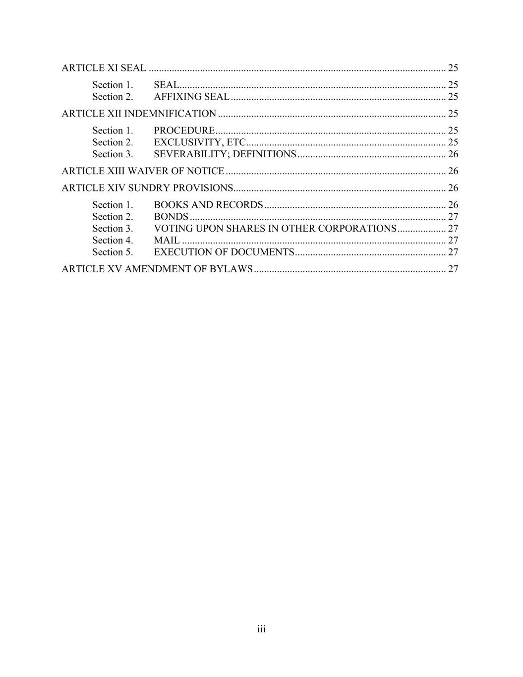 iii ARTICLE XI SEAL .................................................................................................................... 25 Section 1. SEAL........................................................................................................ 25 Section 2. AFFIXING SEAL .................................................................................... 25 ARTICLE XII INDEMNIFICATION ......................................................................................... 25 Section 1. PROCEDURE .......................................................................................... 25 Section 2. EXCLUSIVITY, ETC.............................................................................. 25 Section 3. SEVERABILITY; DEFINITIONS .......................................................... 26 ARTICLE XIII WAIVER OF NOTICE ...................................................................................... 26 ARTICLE XIV SUNDRY PROVISIONS................................................................................... 26 Section 1. BOOKS AND RECORDS ....................................................................... 26 Section 2. BONDS .................................................................................................... 27 Section 3. VOTING UPON SHARES IN OTHER CORPORATIONS ................... 27 Section 4. MAIL ....................................................................................................... 27 Section 5. EXECUTION OF DOCUMENTS ........................................................... 27 ARTICLE XV AMENDMENT OF BYLAWS ........................................................................... 27
