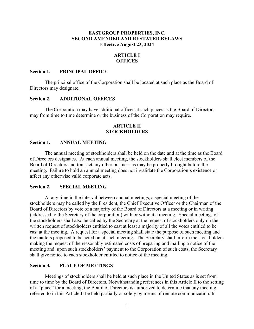 1 EASTGROUP PROPERTIES, INC. SECOND AMENDED AND RESTATED BYLAWS Effective August 23, 2024 ARTICLE I OFFICES Section 1. PRINCIPAL OFFICE The principal office of the Corporation shall be located at such place as the Board of Directors may designate. Section 2. ADDITIONAL OFFICES The Corporation may have additional offices at such places as the Board of Directors may from time to time determine or the business of the Corporation may require. ARTICLE II STOCKHOLDERS Section 1. ANNUAL MEETING The annual meeting of stockholders shall be held on the date and at the time as the Board of Directors designates. At each annual meeting, the stockholders shall elect members of the Board of Directors and transact any other business as may be properly brought before the meeting. Failure to hold an annual meeting does not invalidate the Corporation’s existence or affect any otherwise valid corporate acts. Section 2. SPECIAL MEETING At any time in the interval between annual meetings, a special meeting of the stockholders may be called by the President, the Chief Executive Officer or the Chairman of the Board of Directors by vote of a majority of the Board of Directors at a meeting or in writing (addressed to the Secretary of the corporation) with or without a meeting. Special meetings of the stockholders shall also be called by the Secretary at the request of stockholders only on the written request of stockholders entitled to cast at least a majority of all the votes entitled to be cast at the meeting. A request for a special meeting shall state the purpose of such meeting and the matters proposed to be acted on at such meeting. The Secretary shall inform the stockholders making the request of the reasonably estimated costs of preparing and mailing a notice of the meeting and, upon such stockholders’ payment to the Corporation of such costs, the Secretary shall give notice to each stockholder entitled to notice of the meeting. Section 3. PLACE OF MEETINGS Meetings of stockholders shall be held at such place in the United States as is set from time to time by the Board of Directors. Notwithstanding references in this Article II to the setting of a “place” for a meeting, the Board of Directors is authorized to determine that any meeting referred to in this Article II be held partially or solely by means of remote communication. In