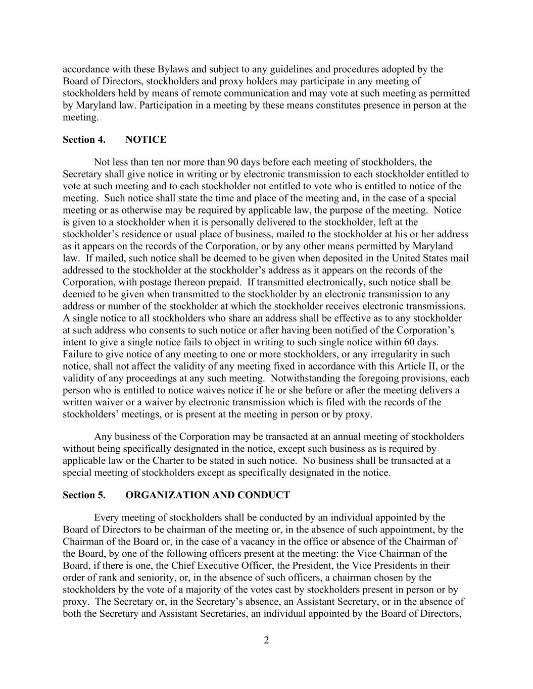 2 accordance with these Bylaws and subject to any guidelines and procedures adopted by the Board of Directors, stockholders and proxy holders may participate in any meeting of stockholders held by means of remote communication and may vote at such meeting as permitted by Maryland law. Participation in a meeting by these means constitutes presence in person at the meeting. Section 4. NOTICE Not less than ten nor more than 90 days before each meeting of stockholders, the Secretary shall give notice in writing or by electronic transmission to each stockholder entitled to vote at such meeting and to each stockholder not entitled to vote who is entitled to notice of the meeting. Such notice shall state the time and place of the meeting and, in the case of a special meeting or as otherwise may be required by applicable law, the purpose of the meeting. Notice is given to a stockholder when it is personally delivered to the stockholder, left at the stockholder’s residence or usual place of business, mailed to the stockholder at his or her address as it appears on the records of the Corporation, or by any other means permitted by Maryland law. If mailed, such notice shall be deemed to be given when deposited in the United States mail addressed to the stockholder at the stockholder’s address as it appears on the records of the Corporation, with postage thereon prepaid. If transmitted electronically, such notice shall be deemed to be given when transmitted to the stockholder by an electronic transmission to any address or number of the stockholder at which the stockholder receives electronic transmissions. A single notice to all stockholders who share an address shall be effective as to any stockholder at such address who consents to such notice or after having been notified of the Corporation’s intent to give a single notice fails to object in writing to such single notice within 60 days. Failure to give notice of any meeting to one or more stockholders, or any irregularity in such notice, shall not affect the validity of any meeting fixed in accordance with this Article II, or the validity of any proceedings at any such meeting. Notwithstanding the foregoing provisions, each person who is entitled to notice waives notice if he or she before or after the meeting delivers a written waiver or a waiver by electronic transmission which is filed with the records of the stockholders’ meetings, or is present at the meeting in person or by proxy. Any business of the Corporation may be transacted at an annual meeting of stockholders without being specifically designated in the notice, except such business as is required by applicable law or the Charter to be stated in such notice. No business shall be transacted at a special meeting of stockholders except as specifically designated in the notice. Section 5. ORGANIZATION AND CONDUCT Every meeting of stockholders shall be conducted by an individual appointed by the Board of Directors to be chairman of the meeting or, in the absence of such appointment, by the Chairman of the Board or, in the case of a vacancy in the office or absence of the Chairman of the Board, by one of the following officers present at the meeting: the Vice Chairman of the Board, if there is one, the Chief Executive Officer, the President, the Vice Presidents in their order of rank and seniority, or, in the absence of such officers, a chairman chosen by the stockholders by the vote of a majority of the votes cast by stockholders present in person or by proxy. The Secretary or, in the Secretary’s absence, an Assistant Secretary, or in the absence of both the Secretary and Assistant Secretaries, an individual appointed by the Board of Directors,