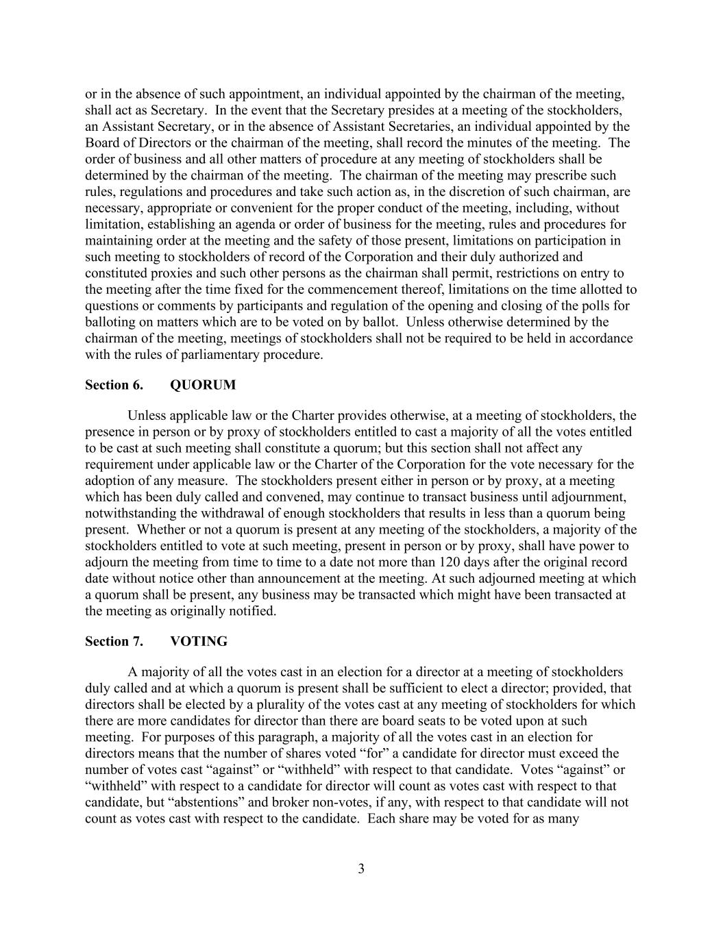 3 or in the absence of such appointment, an individual appointed by the chairman of the meeting, shall act as Secretary. In the event that the Secretary presides at a meeting of the stockholders, an Assistant Secretary, or in the absence of Assistant Secretaries, an individual appointed by the Board of Directors or the chairman of the meeting, shall record the minutes of the meeting. The order of business and all other matters of procedure at any meeting of stockholders shall be determined by the chairman of the meeting. The chairman of the meeting may prescribe such rules, regulations and procedures and take such action as, in the discretion of such chairman, are necessary, appropriate or convenient for the proper conduct of the meeting, including, without limitation, establishing an agenda or order of business for the meeting, rules and procedures for maintaining order at the meeting and the safety of those present, limitations on participation in such meeting to stockholders of record of the Corporation and their duly authorized and constituted proxies and such other persons as the chairman shall permit, restrictions on entry to the meeting after the time fixed for the commencement thereof, limitations on the time allotted to questions or comments by participants and regulation of the opening and closing of the polls for balloting on matters which are to be voted on by ballot. Unless otherwise determined by the chairman of the meeting, meetings of stockholders shall not be required to be held in accordance with the rules of parliamentary procedure. Section 6. QUORUM Unless applicable law or the Charter provides otherwise, at a meeting of stockholders, the presence in person or by proxy of stockholders entitled to cast a majority of all the votes entitled to be cast at such meeting shall constitute a quorum; but this section shall not affect any requirement under applicable law or the Charter of the Corporation for the vote necessary for the adoption of any measure. The stockholders present either in person or by proxy, at a meeting which has been duly called and convened, may continue to transact business until adjournment, notwithstanding the withdrawal of enough stockholders that results in less than a quorum being present. Whether or not a quorum is present at any meeting of the stockholders, a majority of the stockholders entitled to vote at such meeting, present in person or by proxy, shall have power to adjourn the meeting from time to time to a date not more than 120 days after the original record date without notice other than announcement at the meeting. At such adjourned meeting at which a quorum shall be present, any business may be transacted which might have been transacted at the meeting as originally notified. Section 7. VOTING A majority of all the votes cast in an election for a director at a meeting of stockholders duly called and at which a quorum is present shall be sufficient to elect a director; provided, that directors shall be elected by a plurality of the votes cast at any meeting of stockholders for which there are more candidates for director than there are board seats to be voted upon at such meeting. For purposes of this paragraph, a majority of all the votes cast in an election for directors means that the number of shares voted “for” a candidate for director must exceed the number of votes cast “against” or “withheld” with respect to that candidate. Votes “against” or “withheld” with respect to a candidate for director will count as votes cast with respect to that candidate, but “abstentions” and broker non-votes, if any, with respect to that candidate will not count as votes cast with respect to the candidate. Each share may be voted for as many