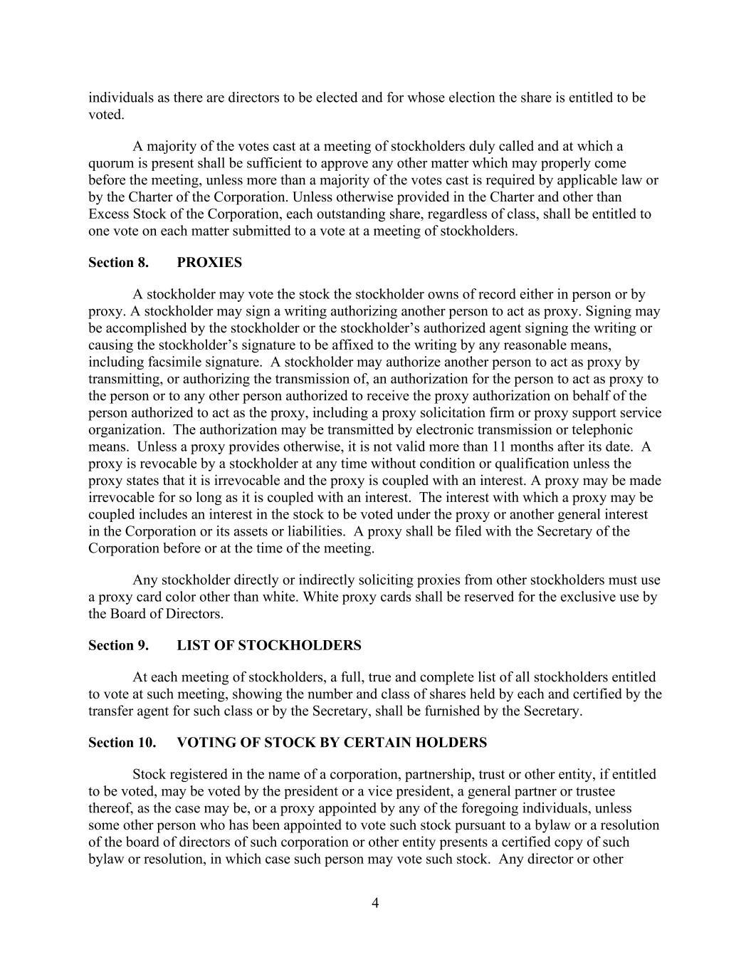 4 individuals as there are directors to be elected and for whose election the share is entitled to be voted. A majority of the votes cast at a meeting of stockholders duly called and at which a quorum is present shall be sufficient to approve any other matter which may properly come before the meeting, unless more than a majority of the votes cast is required by applicable law or by the Charter of the Corporation. Unless otherwise provided in the Charter and other than Excess Stock of the Corporation, each outstanding share, regardless of class, shall be entitled to one vote on each matter submitted to a vote at a meeting of stockholders. Section 8. PROXIES A stockholder may vote the stock the stockholder owns of record either in person or by proxy. A stockholder may sign a writing authorizing another person to act as proxy. Signing may be accomplished by the stockholder or the stockholder’s authorized agent signing the writing or causing the stockholder’s signature to be affixed to the writing by any reasonable means, including facsimile signature. A stockholder may authorize another person to act as proxy by transmitting, or authorizing the transmission of, an authorization for the person to act as proxy to the person or to any other person authorized to receive the proxy authorization on behalf of the person authorized to act as the proxy, including a proxy solicitation firm or proxy support service organization. The authorization may be transmitted by electronic transmission or telephonic means. Unless a proxy provides otherwise, it is not valid more than 11 months after its date. A proxy is revocable by a stockholder at any time without condition or qualification unless the proxy states that it is irrevocable and the proxy is coupled with an interest. A proxy may be made irrevocable for so long as it is coupled with an interest. The interest with which a proxy may be coupled includes an interest in the stock to be voted under the proxy or another general interest in the Corporation or its assets or liabilities. A proxy shall be filed with the Secretary of the Corporation before or at the time of the meeting. Any stockholder directly or indirectly soliciting proxies from other stockholders must use a proxy card color other than white. White proxy cards shall be reserved for the exclusive use by the Board of Directors. Section 9. LIST OF STOCKHOLDERS At each meeting of stockholders, a full, true and complete list of all stockholders entitled to vote at such meeting, showing the number and class of shares held by each and certified by the transfer agent for such class or by the Secretary, shall be furnished by the Secretary. Section 10. VOTING OF STOCK BY CERTAIN HOLDERS Stock registered in the name of a corporation, partnership, trust or other entity, if entitled to be voted, may be voted by the president or a vice president, a general partner or trustee thereof, as the case may be, or a proxy appointed by any of the foregoing individuals, unless some other person who has been appointed to vote such stock pursuant to a bylaw or a resolution of the board of directors of such corporation or other entity presents a certified copy of such bylaw or resolution, in which case such person may vote such stock. Any director or other