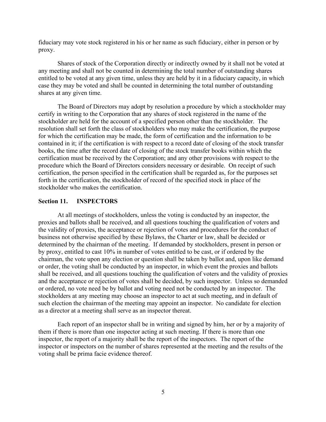 5 fiduciary may vote stock registered in his or her name as such fiduciary, either in person or by proxy. Shares of stock of the Corporation directly or indirectly owned by it shall not be voted at any meeting and shall not be counted in determining the total number of outstanding shares entitled to be voted at any given time, unless they are held by it in a fiduciary capacity, in which case they may be voted and shall be counted in determining the total number of outstanding shares at any given time. The Board of Directors may adopt by resolution a procedure by which a stockholder may certify in writing to the Corporation that any shares of stock registered in the name of the stockholder are held for the account of a specified person other than the stockholder. The resolution shall set forth the class of stockholders who may make the certification, the purpose for which the certification may be made, the form of certification and the information to be contained in it; if the certification is with respect to a record date of closing of the stock transfer books, the time after the record date of closing of the stock transfer books within which the certification must be received by the Corporation; and any other provisions with respect to the procedure which the Board of Directors considers necessary or desirable. On receipt of such certification, the person specified in the certification shall be regarded as, for the purposes set forth in the certification, the stockholder of record of the specified stock in place of the stockholder who makes the certification. Section 11. INSPECTORS At all meetings of stockholders, unless the voting is conducted by an inspector, the proxies and ballots shall be received, and all questions touching the qualification of voters and the validity of proxies, the acceptance or rejection of votes and procedures for the conduct of business not otherwise specified by these Bylaws, the Charter or law, shall be decided or determined by the chairman of the meeting. If demanded by stockholders, present in person or by proxy, entitled to cast 10% in number of votes entitled to be cast, or if ordered by the chairman, the vote upon any election or question shall be taken by ballot and, upon like demand or order, the voting shall be conducted by an inspector, in which event the proxies and ballots shall be received, and all questions touching the qualification of voters and the validity of proxies and the acceptance or rejection of votes shall be decided, by such inspector. Unless so demanded or ordered, no vote need be by ballot and voting need not be conducted by an inspector. The stockholders at any meeting may choose an inspector to act at such meeting, and in default of such election the chairman of the meeting may appoint an inspector. No candidate for election as a director at a meeting shall serve as an inspector thereat. Each report of an inspector shall be in writing and signed by him, her or by a majority of them if there is more than one inspector acting at such meeting. If there is more than one inspector, the report of a majority shall be the report of the inspectors. The report of the inspector or inspectors on the number of shares represented at the meeting and the results of the voting shall be prima facie evidence thereof.