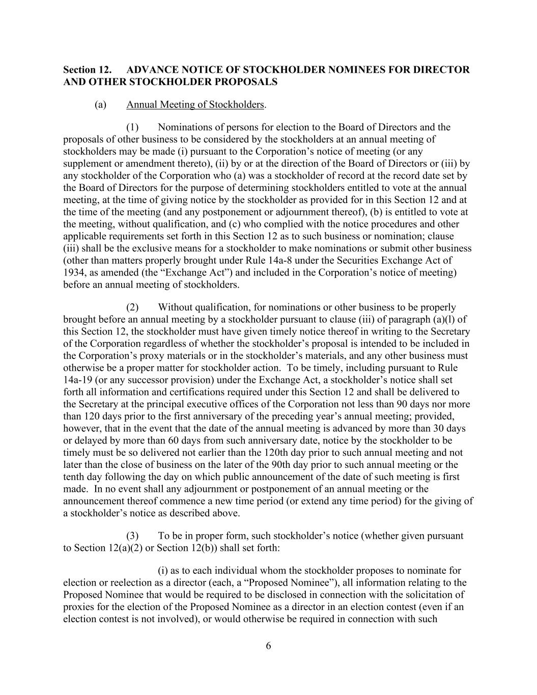6 Section 12. ADVANCE NOTICE OF STOCKHOLDER NOMINEES FOR DIRECTOR AND OTHER STOCKHOLDER PROPOSALS (a) Annual Meeting of Stockholders. (1) Nominations of persons for election to the Board of Directors and the proposals of other business to be considered by the stockholders at an annual meeting of stockholders may be made (i) pursuant to the Corporation’s notice of meeting (or any supplement or amendment thereto), (ii) by or at the direction of the Board of Directors or (iii) by any stockholder of the Corporation who (a) was a stockholder of record at the record date set by the Board of Directors for the purpose of determining stockholders entitled to vote at the annual meeting, at the time of giving notice by the stockholder as provided for in this Section 12 and at the time of the meeting (and any postponement or adjournment thereof), (b) is entitled to vote at the meeting, without qualification, and (c) who complied with the notice procedures and other applicable requirements set forth in this Section 12 as to such business or nomination; clause (iii) shall be the exclusive means for a stockholder to make nominations or submit other business (other than matters properly brought under Rule 14a-8 under the Securities Exchange Act of 1934, as amended (the “Exchange Act”) and included in the Corporation’s notice of meeting) before an annual meeting of stockholders. (2) Without qualification, for nominations or other business to be properly brought before an annual meeting by a stockholder pursuant to clause (iii) of paragraph (a)(l) of this Section 12, the stockholder must have given timely notice thereof in writing to the Secretary of the Corporation regardless of whether the stockholder’s proposal is intended to be included in the Corporation’s proxy materials or in the stockholder’s materials, and any other business must otherwise be a proper matter for stockholder action. To be timely, including pursuant to Rule 14a-19 (or any successor provision) under the Exchange Act, a stockholder’s notice shall set forth all information and certifications required under this Section 12 and shall be delivered to the Secretary at the principal executive offices of the Corporation not less than 90 days nor more than 120 days prior to the first anniversary of the preceding year’s annual meeting; provided, however, that in the event that the date of the annual meeting is advanced by more than 30 days or delayed by more than 60 days from such anniversary date, notice by the stockholder to be timely must be so delivered not earlier than the 120th day prior to such annual meeting and not later than the close of business on the later of the 90th day prior to such annual meeting or the tenth day following the day on which public announcement of the date of such meeting is first made. In no event shall any adjournment or postponement of an annual meeting or the announcement thereof commence a new time period (or extend any time period) for the giving of a stockholder’s notice as described above. (3) To be in proper form, such stockholder’s notice (whether given pursuant to Section 12(a)(2) or Section 12(b)) shall set forth: (i) as to each individual whom the stockholder proposes to nominate for election or reelection as a director (each, a “Proposed Nominee”), all information relating to the Proposed Nominee that would be required to be disclosed in connection with the solicitation of proxies for the election of the Proposed Nominee as a director in an election contest (even if an election contest is not involved), or would otherwise be required in connection with such
