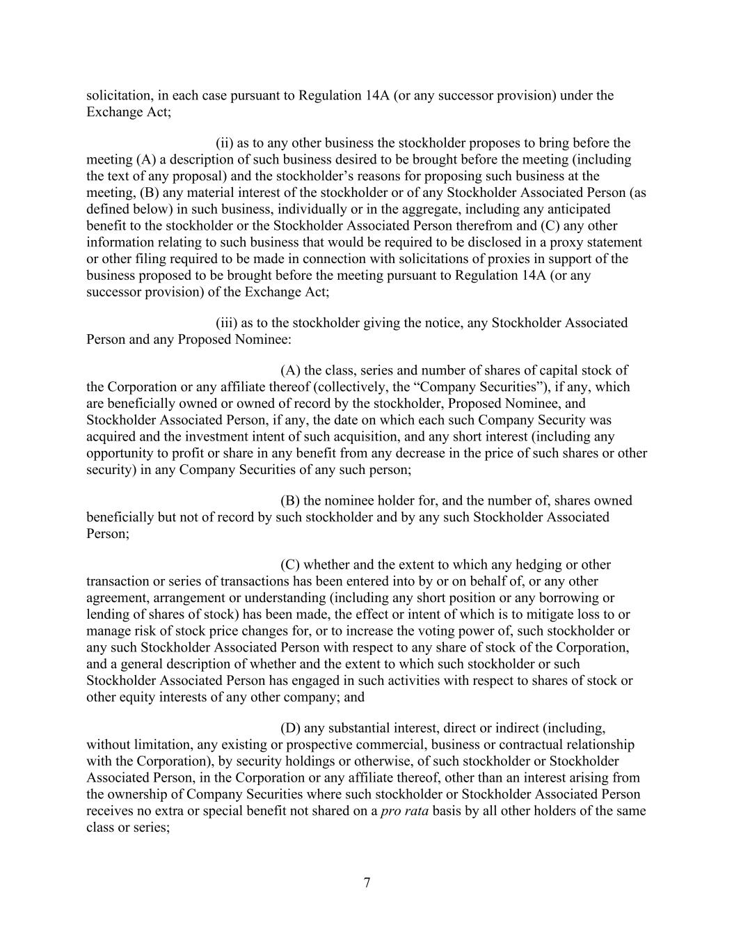 7 solicitation, in each case pursuant to Regulation 14A (or any successor provision) under the Exchange Act; (ii) as to any other business the stockholder proposes to bring before the meeting (A) a description of such business desired to be brought before the meeting (including the text of any proposal) and the stockholder’s reasons for proposing such business at the meeting, (B) any material interest of the stockholder or of any Stockholder Associated Person (as defined below) in such business, individually or in the aggregate, including any anticipated benefit to the stockholder or the Stockholder Associated Person therefrom and (C) any other information relating to such business that would be required to be disclosed in a proxy statement or other filing required to be made in connection with solicitations of proxies in support of the business proposed to be brought before the meeting pursuant to Regulation 14A (or any successor provision) of the Exchange Act; (iii) as to the stockholder giving the notice, any Stockholder Associated Person and any Proposed Nominee: (A) the class, series and number of shares of capital stock of the Corporation or any affiliate thereof (collectively, the “Company Securities”), if any, which are beneficially owned or owned of record by the stockholder, Proposed Nominee, and Stockholder Associated Person, if any, the date on which each such Company Security was acquired and the investment intent of such acquisition, and any short interest (including any opportunity to profit or share in any benefit from any decrease in the price of such shares or other security) in any Company Securities of any such person; (B) the nominee holder for, and the number of, shares owned beneficially but not of record by such stockholder and by any such Stockholder Associated Person; (C) whether and the extent to which any hedging or other transaction or series of transactions has been entered into by or on behalf of, or any other agreement, arrangement or understanding (including any short position or any borrowing or lending of shares of stock) has been made, the effect or intent of which is to mitigate loss to or manage risk of stock price changes for, or to increase the voting power of, such stockholder or any such Stockholder Associated Person with respect to any share of stock of the Corporation, and a general description of whether and the extent to which such stockholder or such Stockholder Associated Person has engaged in such activities with respect to shares of stock or other equity interests of any other company; and (D) any substantial interest, direct or indirect (including, without limitation, any existing or prospective commercial, business or contractual relationship with the Corporation), by security holdings or otherwise, of such stockholder or Stockholder Associated Person, in the Corporation or any affiliate thereof, other than an interest arising from the ownership of Company Securities where such stockholder or Stockholder Associated Person receives no extra or special benefit not shared on a pro rata basis by all other holders of the same class or series;