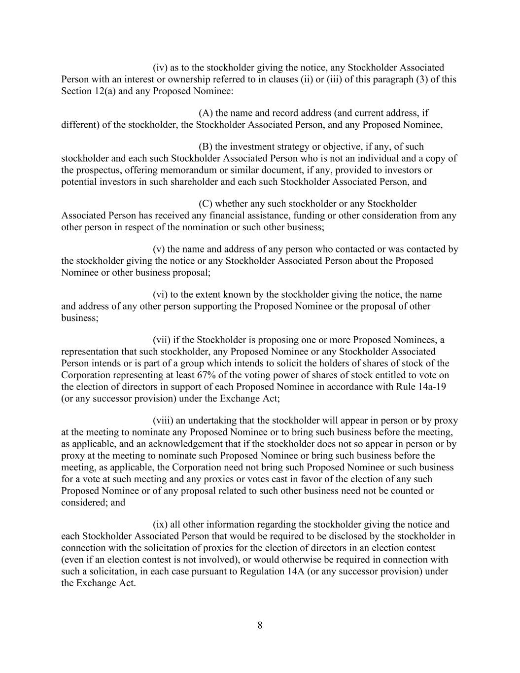 8 (iv) as to the stockholder giving the notice, any Stockholder Associated Person with an interest or ownership referred to in clauses (ii) or (iii) of this paragraph (3) of this Section 12(a) and any Proposed Nominee: (A) the name and record address (and current address, if different) of the stockholder, the Stockholder Associated Person, and any Proposed Nominee, (B) the investment strategy or objective, if any, of such stockholder and each such Stockholder Associated Person who is not an individual and a copy of the prospectus, offering memorandum or similar document, if any, provided to investors or potential investors in such shareholder and each such Stockholder Associated Person, and (C) whether any such stockholder or any Stockholder Associated Person has received any financial assistance, funding or other consideration from any other person in respect of the nomination or such other business; (v) the name and address of any person who contacted or was contacted by the stockholder giving the notice or any Stockholder Associated Person about the Proposed Nominee or other business proposal; (vi) to the extent known by the stockholder giving the notice, the name and address of any other person supporting the Proposed Nominee or the proposal of other business; (vii) if the Stockholder is proposing one or more Proposed Nominees, a representation that such stockholder, any Proposed Nominee or any Stockholder Associated Person intends or is part of a group which intends to solicit the holders of shares of stock of the Corporation representing at least 67% of the voting power of shares of stock entitled to vote on the election of directors in support of each Proposed Nominee in accordance with Rule 14a-19 (or any successor provision) under the Exchange Act; (viii) an undertaking that the stockholder will appear in person or by proxy at the meeting to nominate any Proposed Nominee or to bring such business before the meeting, as applicable, and an acknowledgement that if the stockholder does not so appear in person or by proxy at the meeting to nominate such Proposed Nominee or bring such business before the meeting, as applicable, the Corporation need not bring such Proposed Nominee or such business for a vote at such meeting and any proxies or votes cast in favor of the election of any such Proposed Nominee or of any proposal related to such other business need not be counted or considered; and (ix) all other information regarding the stockholder giving the notice and each Stockholder Associated Person that would be required to be disclosed by the stockholder in connection with the solicitation of proxies for the election of directors in an election contest (even if an election contest is not involved), or would otherwise be required in connection with such a solicitation, in each case pursuant to Regulation 14A (or any successor provision) under the Exchange Act.