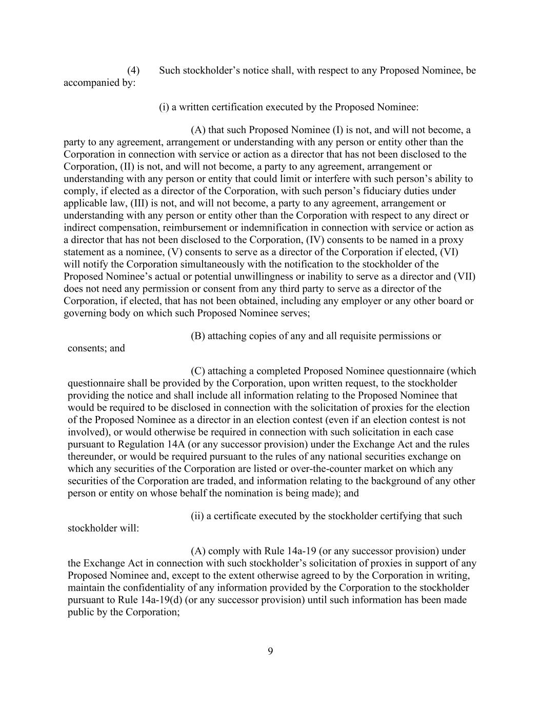 9 (4) Such stockholder’s notice shall, with respect to any Proposed Nominee, be accompanied by: (i) a written certification executed by the Proposed Nominee: (A) that such Proposed Nominee (I) is not, and will not become, a party to any agreement, arrangement or understanding with any person or entity other than the Corporation in connection with service or action as a director that has not been disclosed to the Corporation, (II) is not, and will not become, a party to any agreement, arrangement or understanding with any person or entity that could limit or interfere with such person’s ability to comply, if elected as a director of the Corporation, with such person’s fiduciary duties under applicable law, (III) is not, and will not become, a party to any agreement, arrangement or understanding with any person or entity other than the Corporation with respect to any direct or indirect compensation, reimbursement or indemnification in connection with service or action as a director that has not been disclosed to the Corporation, (IV) consents to be named in a proxy statement as a nominee, (V) consents to serve as a director of the Corporation if elected, (VI) will notify the Corporation simultaneously with the notification to the stockholder of the Proposed Nominee’s actual or potential unwillingness or inability to serve as a director and (VII) does not need any permission or consent from any third party to serve as a director of the Corporation, if elected, that has not been obtained, including any employer or any other board or governing body on which such Proposed Nominee serves; (B) attaching copies of any and all requisite permissions or consents; and (C) attaching a completed Proposed Nominee questionnaire (which questionnaire shall be provided by the Corporation, upon written request, to the stockholder providing the notice and shall include all information relating to the Proposed Nominee that would be required to be disclosed in connection with the solicitation of proxies for the election of the Proposed Nominee as a director in an election contest (even if an election contest is not involved), or would otherwise be required in connection with such solicitation in each case pursuant to Regulation 14A (or any successor provision) under the Exchange Act and the rules thereunder, or would be required pursuant to the rules of any national securities exchange on which any securities of the Corporation are listed or over-the-counter market on which any securities of the Corporation are traded, and information relating to the background of any other person or entity on whose behalf the nomination is being made); and (ii) a certificate executed by the stockholder certifying that such stockholder will: (A) comply with Rule 14a-19 (or any successor provision) under the Exchange Act in connection with such stockholder’s solicitation of proxies in support of any Proposed Nominee and, except to the extent otherwise agreed to by the Corporation in writing, maintain the confidentiality of any information provided by the Corporation to the stockholder pursuant to Rule 14a-19(d) (or any successor provision) until such information has been made public by the Corporation;