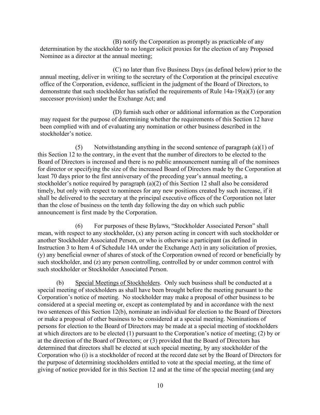 10 (B) notify the Corporation as promptly as practicable of any determination by the stockholder to no longer solicit proxies for the election of any Proposed Nominee as a director at the annual meeting; (C) no later than five Business Days (as defined below) prior to the annual meeting, deliver in writing to the secretary of the Corporation at the principal executive office of the Corporation, evidence, sufficient in the judgment of the Board of Directors, to demonstrate that such stockholder has satisfied the requirements of Rule 14a-19(a)(3) (or any successor provision) under the Exchange Act; and (D) furnish such other or additional information as the Corporation may request for the purpose of determining whether the requirements of this Section 12 have been complied with and of evaluating any nomination or other business described in the stockholder’s notice. (5) Notwithstanding anything in the second sentence of paragraph (a)(1) of this Section 12 to the contrary, in the event that the number of directors to be elected to the Board of Directors is increased and there is no public announcement naming all of the nominees for director or specifying the size of the increased Board of Directors made by the Corporation at least 70 days prior to the first anniversary of the preceding year’s annual meeting, a stockholder’s notice required by paragraph (a)(2) of this Section 12 shall also be considered timely, but only with respect to nominees for any new positions created by such increase, if it shall be delivered to the secretary at the principal executive offices of the Corporation not later than the close of business on the tenth day following the day on which such public announcement is first made by the Corporation. (6) For purposes of these Bylaws, “Stockholder Associated Person” shall mean, with respect to any stockholder, (x) any person acting in concert with such stockholder or another Stockholder Associated Person, or who is otherwise a participant (as defined in Instruction 3 to Item 4 of Schedule 14A under the Exchange Act) in any solicitation of proxies, (y) any beneficial owner of shares of stock of the Corporation owned of record or beneficially by such stockholder, and (z) any person controlling, controlled by or under common control with such stockholder or Stockholder Associated Person. (b) Special Meetings of Stockholders. Only such business shall be conducted at a special meeting of stockholders as shall have been brought before the meeting pursuant to the Corporation’s notice of meeting. No stockholder may make a proposal of other business to be considered at a special meeting or, except as contemplated by and in accordance with the next two sentences of this Section 12(b), nominate an individual for election to the Board of Directors or make a proposal of other business to be considered at a special meeting. Nominations of persons for election to the Board of Directors may be made at a special meeting of stockholders at which directors are to be elected (1) pursuant to the Corporation’s notice of meeting; (2) by or at the direction of the Board of Directors; or (3) provided that the Board of Directors has determined that directors shall be elected at such special meeting, by any stockholder of the Corporation who (i) is a stockholder of record at the record date set by the Board of Directors for the purpose of determining stockholders entitled to vote at the special meeting, at the time of giving of notice provided for in this Section 12 and at the time of the special meeting (and any