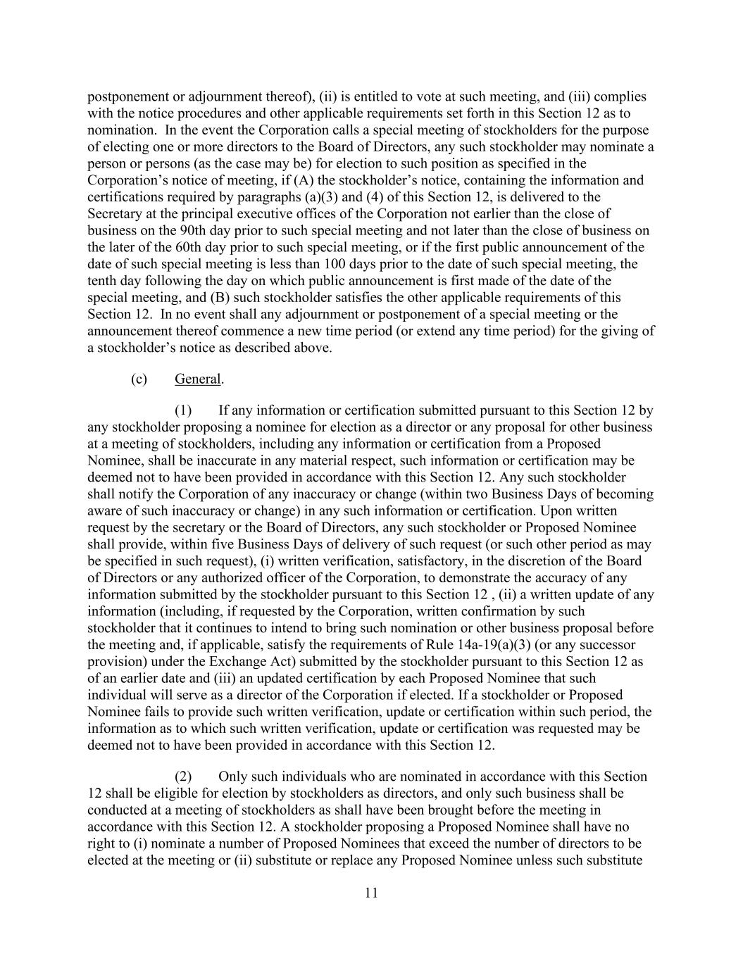11 postponement or adjournment thereof), (ii) is entitled to vote at such meeting, and (iii) complies with the notice procedures and other applicable requirements set forth in this Section 12 as to nomination. In the event the Corporation calls a special meeting of stockholders for the purpose of electing one or more directors to the Board of Directors, any such stockholder may nominate a person or persons (as the case may be) for election to such position as specified in the Corporation’s notice of meeting, if (A) the stockholder’s notice, containing the information and certifications required by paragraphs (a)(3) and (4) of this Section 12, is delivered to the Secretary at the principal executive offices of the Corporation not earlier than the close of business on the 90th day prior to such special meeting and not later than the close of business on the later of the 60th day prior to such special meeting, or if the first public announcement of the date of such special meeting is less than 100 days prior to the date of such special meeting, the tenth day following the day on which public announcement is first made of the date of the special meeting, and (B) such stockholder satisfies the other applicable requirements of this Section 12. In no event shall any adjournment or postponement of a special meeting or the announcement thereof commence a new time period (or extend any time period) for the giving of a stockholder’s notice as described above. (c) General. (1) If any information or certification submitted pursuant to this Section 12 by any stockholder proposing a nominee for election as a director or any proposal for other business at a meeting of stockholders, including any information or certification from a Proposed Nominee, shall be inaccurate in any material respect, such information or certification may be deemed not to have been provided in accordance with this Section 12. Any such stockholder shall notify the Corporation of any inaccuracy or change (within two Business Days of becoming aware of such inaccuracy or change) in any such information or certification. Upon written request by the secretary or the Board of Directors, any such stockholder or Proposed Nominee shall provide, within five Business Days of delivery of such request (or such other period as may be specified in such request), (i) written verification, satisfactory, in the discretion of the Board of Directors or any authorized officer of the Corporation, to demonstrate the accuracy of any information submitted by the stockholder pursuant to this Section 12 , (ii) a written update of any information (including, if requested by the Corporation, written confirmation by such stockholder that it continues to intend to bring such nomination or other business proposal before the meeting and, if applicable, satisfy the requirements of Rule 14a-19(a)(3) (or any successor provision) under the Exchange Act) submitted by the stockholder pursuant to this Section 12 as of an earlier date and (iii) an updated certification by each Proposed Nominee that such individual will serve as a director of the Corporation if elected. If a stockholder or Proposed Nominee fails to provide such written verification, update or certification within such period, the information as to which such written verification, update or certification was requested may be deemed not to have been provided in accordance with this Section 12. (2) Only such individuals who are nominated in accordance with this Section 12 shall be eligible for election by stockholders as directors, and only such business shall be conducted at a meeting of stockholders as shall have been brought before the meeting in accordance with this Section 12. A stockholder proposing a Proposed Nominee shall have no right to (i) nominate a number of Proposed Nominees that exceed the number of directors to be elected at the meeting or (ii) substitute or replace any Proposed Nominee unless such substitute