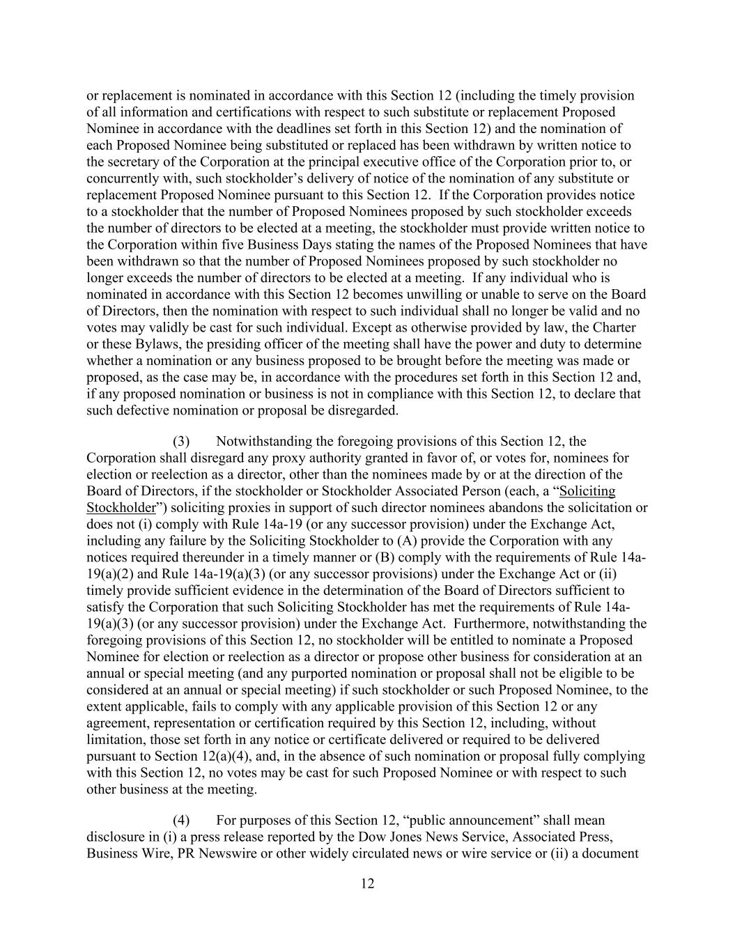 12 or replacement is nominated in accordance with this Section 12 (including the timely provision of all information and certifications with respect to such substitute or replacement Proposed Nominee in accordance with the deadlines set forth in this Section 12) and the nomination of each Proposed Nominee being substituted or replaced has been withdrawn by written notice to the secretary of the Corporation at the principal executive office of the Corporation prior to, or concurrently with, such stockholder’s delivery of notice of the nomination of any substitute or replacement Proposed Nominee pursuant to this Section 12. If the Corporation provides notice to a stockholder that the number of Proposed Nominees proposed by such stockholder exceeds the number of directors to be elected at a meeting, the stockholder must provide written notice to the Corporation within five Business Days stating the names of the Proposed Nominees that have been withdrawn so that the number of Proposed Nominees proposed by such stockholder no longer exceeds the number of directors to be elected at a meeting. If any individual who is nominated in accordance with this Section 12 becomes unwilling or unable to serve on the Board of Directors, then the nomination with respect to such individual shall no longer be valid and no votes may validly be cast for such individual. Except as otherwise provided by law, the Charter or these Bylaws, the presiding officer of the meeting shall have the power and duty to determine whether a nomination or any business proposed to be brought before the meeting was made or proposed, as the case may be, in accordance with the procedures set forth in this Section 12 and, if any proposed nomination or business is not in compliance with this Section 12, to declare that such defective nomination or proposal be disregarded. (3) Notwithstanding the foregoing provisions of this Section 12, the Corporation shall disregard any proxy authority granted in favor of, or votes for, nominees for election or reelection as a director, other than the nominees made by or at the direction of the Board of Directors, if the stockholder or Stockholder Associated Person (each, a “Soliciting Stockholder”) soliciting proxies in support of such director nominees abandons the solicitation or does not (i) comply with Rule 14a-19 (or any successor provision) under the Exchange Act, including any failure by the Soliciting Stockholder to (A) provide the Corporation with any notices required thereunder in a timely manner or (B) comply with the requirements of Rule 14a- 19(a)(2) and Rule 14a-19(a)(3) (or any successor provisions) under the Exchange Act or (ii) timely provide sufficient evidence in the determination of the Board of Directors sufficient to satisfy the Corporation that such Soliciting Stockholder has met the requirements of Rule 14a- 19(a)(3) (or any successor provision) under the Exchange Act. Furthermore, notwithstanding the foregoing provisions of this Section 12, no stockholder will be entitled to nominate a Proposed Nominee for election or reelection as a director or propose other business for consideration at an annual or special meeting (and any purported nomination or proposal shall not be eligible to be considered at an annual or special meeting) if such stockholder or such Proposed Nominee, to the extent applicable, fails to comply with any applicable provision of this Section 12 or any agreement, representation or certification required by this Section 12, including, without limitation, those set forth in any notice or certificate delivered or required to be delivered pursuant to Section 12(a)(4), and, in the absence of such nomination or proposal fully complying with this Section 12, no votes may be cast for such Proposed Nominee or with respect to such other business at the meeting. (4) For purposes of this Section 12, “public announcement” shall mean disclosure in (i) a press release reported by the Dow Jones News Service, Associated Press, Business Wire, PR Newswire or other widely circulated news or wire service or (ii) a document