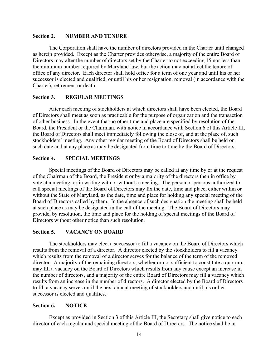14 Section 2. NUMBER AND TENURE The Corporation shall have the number of directors provided in the Charter until changed as herein provided. Except as the Charter provides otherwise, a majority of the entire Board of Directors may alter the number of directors set by the Charter to not exceeding 15 nor less than the minimum number required by Maryland law, but the action may not affect the tenure of office of any director. Each director shall hold office for a term of one year and until his or her successor is elected and qualified, or until his or her resignation, removal (in accordance with the Charter), retirement or death. Section 3. REGULAR MEETINGS After each meeting of stockholders at which directors shall have been elected, the Board of Directors shall meet as soon as practicable for the purpose of organization and the transaction of other business. In the event that no other time and place are specified by resolution of the Board, the President or the Chairman, with notice in accordance with Section 6 of this Article III, the Board of Directors shall meet immediately following the close of, and at the place of, such stockholders’ meeting. Any other regular meeting of the Board of Directors shall be held on such date and at any place as may be designated from time to time by the Board of Directors. Section 4. SPECIAL MEETINGS Special meetings of the Board of Directors may be called at any time by or at the request of the Chairman of the Board, the President or by a majority of the directors then in office by vote at a meeting, or in writing with or without a meeting. The person or persons authorized to call special meetings of the Board of Directors may fix the date, time and place, either within or without the State of Maryland, as the date, time and place for holding any special meeting of the Board of Directors called by them. In the absence of such designation the meeting shall be held at such place as may be designated in the call of the meeting. The Board of Directors may provide, by resolution, the time and place for the holding of special meetings of the Board of Directors without other notice than such resolution. Section 5. VACANCY ON BOARD The stockholders may elect a successor to fill a vacancy on the Board of Directors which results from the removal of a director. A director elected by the stockholders to fill a vacancy which results from the removal of a director serves for the balance of the term of the removed director. A majority of the remaining directors, whether or not sufficient to constitute a quorum, may fill a vacancy on the Board of Directors which results from any cause except an increase in the number of directors, and a majority of the entire Board of Directors may fill a vacancy which results from an increase in the number of directors. A director elected by the Board of Directors to fill a vacancy serves until the next annual meeting of stockholders and until his or her successor is elected and qualifies. Section 6. NOTICE Except as provided in Section 3 of this Article III, the Secretary shall give notice to each director of each regular and special meeting of the Board of Directors. The notice shall be in