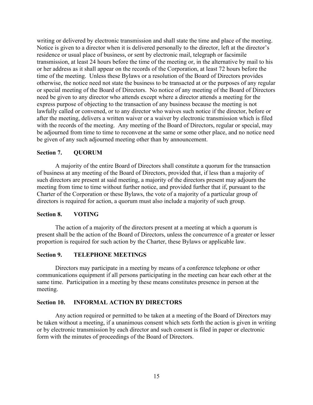 15 writing or delivered by electronic transmission and shall state the time and place of the meeting. Notice is given to a director when it is delivered personally to the director, left at the director’s residence or usual place of business, or sent by electronic mail, telegraph or facsimile transmission, at least 24 hours before the time of the meeting or, in the alternative by mail to his or her address as it shall appear on the records of the Corporation, at least 72 hours before the time of the meeting. Unless these Bylaws or a resolution of the Board of Directors provides otherwise, the notice need not state the business to be transacted at or the purposes of any regular or special meeting of the Board of Directors. No notice of any meeting of the Board of Directors need be given to any director who attends except where a director attends a meeting for the express purpose of objecting to the transaction of any business because the meeting is not lawfully called or convened, or to any director who waives such notice if the director, before or after the meeting, delivers a written waiver or a waiver by electronic transmission which is filed with the records of the meeting. Any meeting of the Board of Directors, regular or special, may be adjourned from time to time to reconvene at the same or some other place, and no notice need be given of any such adjourned meeting other than by announcement. Section 7. QUORUM A majority of the entire Board of Directors shall constitute a quorum for the transaction of business at any meeting of the Board of Directors, provided that, if less than a majority of such directors are present at said meeting, a majority of the directors present may adjourn the meeting from time to time without further notice, and provided further that if, pursuant to the Charter of the Corporation or these Bylaws, the vote of a majority of a particular group of directors is required for action, a quorum must also include a majority of such group. Section 8. VOTING The action of a majority of the directors present at a meeting at which a quorum is present shall be the action of the Board of Directors, unless the concurrence of a greater or lesser proportion is required for such action by the Charter, these Bylaws or applicable law. Section 9. TELEPHONE MEETINGS Directors may participate in a meeting by means of a conference telephone or other communications equipment if all persons participating in the meeting can hear each other at the same time. Participation in a meeting by these means constitutes presence in person at the meeting. Section 10. INFORMAL ACTION BY DIRECTORS Any action required or permitted to be taken at a meeting of the Board of Directors may be taken without a meeting, if a unanimous consent which sets forth the action is given in writing or by electronic transmission by each director and such consent is filed in paper or electronic form with the minutes of proceedings of the Board of Directors.