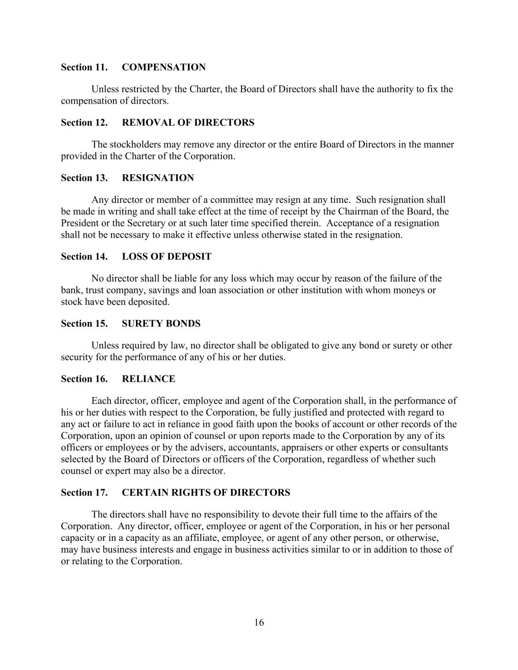 16 Section 11. COMPENSATION Unless restricted by the Charter, the Board of Directors shall have the authority to fix the compensation of directors. Section 12. REMOVAL OF DIRECTORS The stockholders may remove any director or the entire Board of Directors in the manner provided in the Charter of the Corporation. Section 13. RESIGNATION Any director or member of a committee may resign at any time. Such resignation shall be made in writing and shall take effect at the time of receipt by the Chairman of the Board, the President or the Secretary or at such later time specified therein. Acceptance of a resignation shall not be necessary to make it effective unless otherwise stated in the resignation. Section 14. LOSS OF DEPOSIT No director shall be liable for any loss which may occur by reason of the failure of the bank, trust company, savings and loan association or other institution with whom moneys or stock have been deposited. Section 15. SURETY BONDS Unless required by law, no director shall be obligated to give any bond or surety or other security for the performance of any of his or her duties. Section 16. RELIANCE Each director, officer, employee and agent of the Corporation shall, in the performance of his or her duties with respect to the Corporation, be fully justified and protected with regard to any act or failure to act in reliance in good faith upon the books of account or other records of the Corporation, upon an opinion of counsel or upon reports made to the Corporation by any of its officers or employees or by the advisers, accountants, appraisers or other experts or consultants selected by the Board of Directors or officers of the Corporation, regardless of whether such counsel or expert may also be a director. Section 17. CERTAIN RIGHTS OF DIRECTORS The directors shall have no responsibility to devote their full time to the affairs of the Corporation. Any director, officer, employee or agent of the Corporation, in his or her personal capacity or in a capacity as an affiliate, employee, or agent of any other person, or otherwise, may have business interests and engage in business activities similar to or in addition to those of or relating to the Corporation.