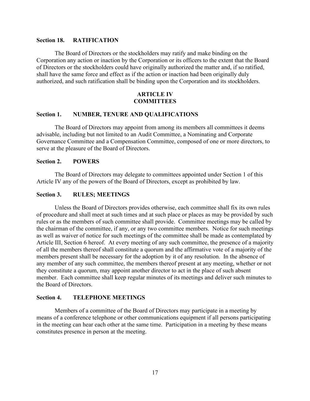 17 Section 18. RATIFICATION The Board of Directors or the stockholders may ratify and make binding on the Corporation any action or inaction by the Corporation or its officers to the extent that the Board of Directors or the stockholders could have originally authorized the matter and, if so ratified, shall have the same force and effect as if the action or inaction had been originally duly authorized, and such ratification shall be binding upon the Corporation and its stockholders. ARTICLE IV COMMITTEES Section 1. NUMBER, TENURE AND QUALIFICATIONS The Board of Directors may appoint from among its members all committees it deems advisable, including but not limited to an Audit Committee, a Nominating and Corporate Governance Committee and a Compensation Committee, composed of one or more directors, to serve at the pleasure of the Board of Directors. Section 2. POWERS The Board of Directors may delegate to committees appointed under Section 1 of this Article IV any of the powers of the Board of Directors, except as prohibited by law. Section 3. RULES; MEETINGS Unless the Board of Directors provides otherwise, each committee shall fix its own rules of procedure and shall meet at such times and at such place or places as may be provided by such rules or as the members of such committee shall provide. Committee meetings may be called by the chairman of the committee, if any, or any two committee members. Notice for such meetings as well as waiver of notice for such meetings of the committee shall be made as contemplated by Article III, Section 6 hereof. At every meeting of any such committee, the presence of a majority of all the members thereof shall constitute a quorum and the affirmative vote of a majority of the members present shall be necessary for the adoption by it of any resolution. In the absence of any member of any such committee, the members thereof present at any meeting, whether or not they constitute a quorum, may appoint another director to act in the place of such absent member. Each committee shall keep regular minutes of its meetings and deliver such minutes to the Board of Directors. Section 4. TELEPHONE MEETINGS Members of a committee of the Board of Directors may participate in a meeting by means of a conference telephone or other communications equipment if all persons participating in the meeting can hear each other at the same time. Participation in a meeting by these means constitutes presence in person at the meeting.