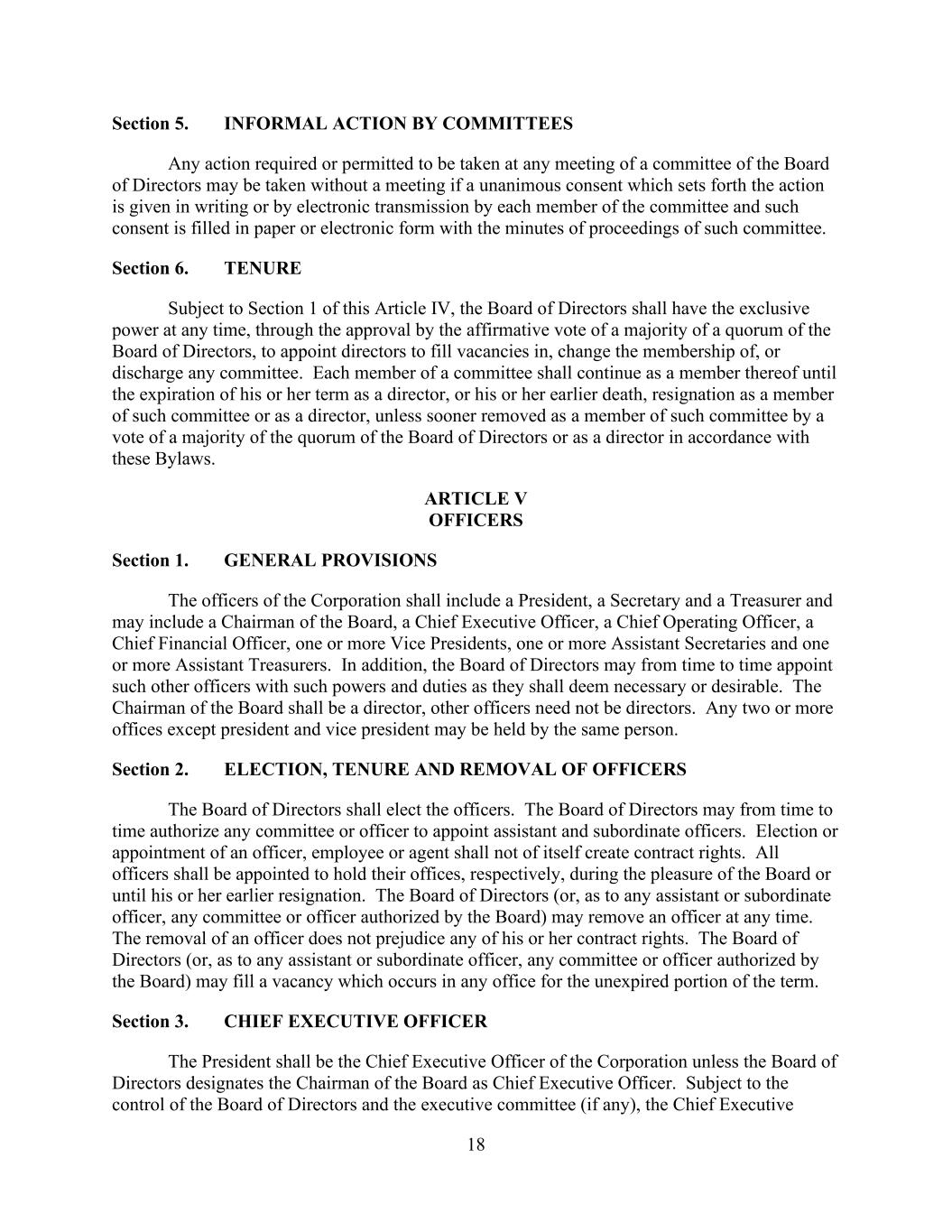 18 Section 5. INFORMAL ACTION BY COMMITTEES Any action required or permitted to be taken at any meeting of a committee of the Board of Directors may be taken without a meeting if a unanimous consent which sets forth the action is given in writing or by electronic transmission by each member of the committee and such consent is filled in paper or electronic form with the minutes of proceedings of such committee. Section 6. TENURE Subject to Section 1 of this Article IV, the Board of Directors shall have the exclusive power at any time, through the approval by the affirmative vote of a majority of a quorum of the Board of Directors, to appoint directors to fill vacancies in, change the membership of, or discharge any committee. Each member of a committee shall continue as a member thereof until the expiration of his or her term as a director, or his or her earlier death, resignation as a member of such committee or as a director, unless sooner removed as a member of such committee by a vote of a majority of the quorum of the Board of Directors or as a director in accordance with these Bylaws. ARTICLE V OFFICERS Section 1. GENERAL PROVISIONS The officers of the Corporation shall include a President, a Secretary and a Treasurer and may include a Chairman of the Board, a Chief Executive Officer, a Chief Operating Officer, a Chief Financial Officer, one or more Vice Presidents, one or more Assistant Secretaries and one or more Assistant Treasurers. In addition, the Board of Directors may from time to time appoint such other officers with such powers and duties as they shall deem necessary or desirable. The Chairman of the Board shall be a director, other officers need not be directors. Any two or more offices except president and vice president may be held by the same person. Section 2. ELECTION, TENURE AND REMOVAL OF OFFICERS The Board of Directors shall elect the officers. The Board of Directors may from time to time authorize any committee or officer to appoint assistant and subordinate officers. Election or appointment of an officer, employee or agent shall not of itself create contract rights. All officers shall be appointed to hold their offices, respectively, during the pleasure of the Board or until his or her earlier resignation. The Board of Directors (or, as to any assistant or subordinate officer, any committee or officer authorized by the Board) may remove an officer at any time. The removal of an officer does not prejudice any of his or her contract rights. The Board of Directors (or, as to any assistant or subordinate officer, any committee or officer authorized by the Board) may fill a vacancy which occurs in any office for the unexpired portion of the term. Section 3. CHIEF EXECUTIVE OFFICER The President shall be the Chief Executive Officer of the Corporation unless the Board of Directors designates the Chairman of the Board as Chief Executive Officer. Subject to the control of the Board of Directors and the executive committee (if any), the Chief Executive