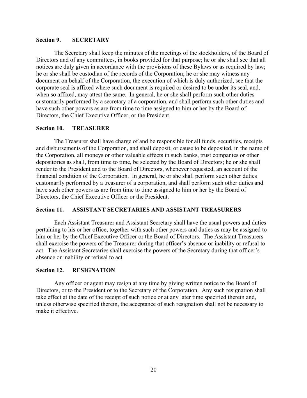 20 Section 9. SECRETARY The Secretary shall keep the minutes of the meetings of the stockholders, of the Board of Directors and of any committees, in books provided for that purpose; he or she shall see that all notices are duly given in accordance with the provisions of these Bylaws or as required by law; he or she shall be custodian of the records of the Corporation; he or she may witness any document on behalf of the Corporation, the execution of which is duly authorized, see that the corporate seal is affixed where such document is required or desired to be under its seal, and, when so affixed, may attest the same. In general, he or she shall perform such other duties customarily performed by a secretary of a corporation, and shall perform such other duties and have such other powers as are from time to time assigned to him or her by the Board of Directors, the Chief Executive Officer, or the President. Section 10. TREASURER The Treasurer shall have charge of and be responsible for all funds, securities, receipts and disbursements of the Corporation, and shall deposit, or cause to be deposited, in the name of the Corporation, all moneys or other valuable effects in such banks, trust companies or other depositories as shall, from time to time, be selected by the Board of Directors; he or she shall render to the President and to the Board of Directors, whenever requested, an account of the financial condition of the Corporation. In general, he or she shall perform such other duties customarily performed by a treasurer of a corporation, and shall perform such other duties and have such other powers as are from time to time assigned to him or her by the Board of Directors, the Chief Executive Officer or the President. Section 11. ASSISTANT SECRETARIES AND ASSISTANT TREASURERS Each Assistant Treasurer and Assistant Secretary shall have the usual powers and duties pertaining to his or her office, together with such other powers and duties as may be assigned to him or her by the Chief Executive Officer or the Board of Directors. The Assistant Treasurers shall exercise the powers of the Treasurer during that officer’s absence or inability or refusal to act. The Assistant Secretaries shall exercise the powers of the Secretary during that officer’s absence or inability or refusal to act. Section 12. RESIGNATION Any officer or agent may resign at any time by giving written notice to the Board of Directors, or to the President or to the Secretary of the Corporation. Any such resignation shall take effect at the date of the receipt of such notice or at any later time specified therein and, unless otherwise specified therein, the acceptance of such resignation shall not be necessary to make it effective.