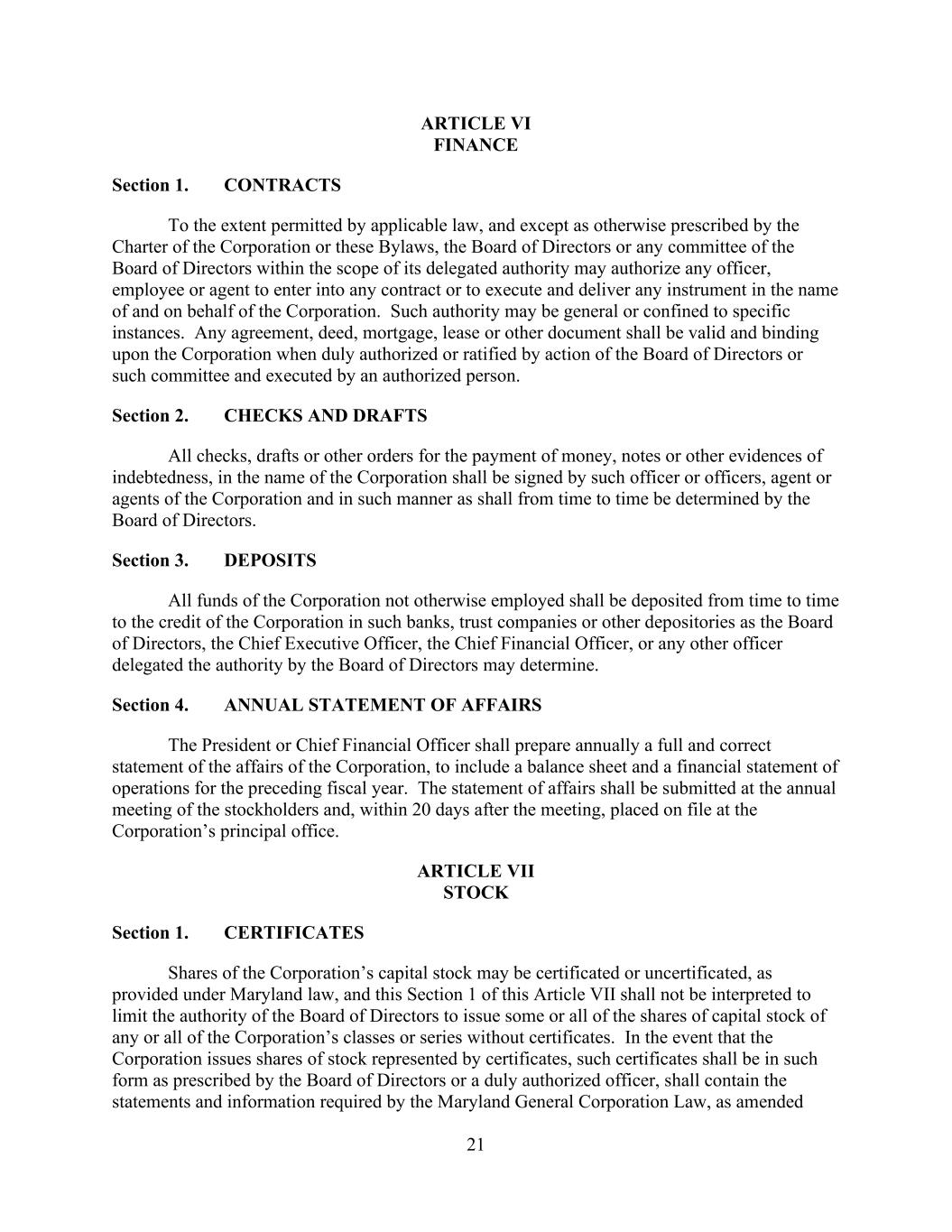 21 ARTICLE VI FINANCE Section 1. CONTRACTS To the extent permitted by applicable law, and except as otherwise prescribed by the Charter of the Corporation or these Bylaws, the Board of Directors or any committee of the Board of Directors within the scope of its delegated authority may authorize any officer, employee or agent to enter into any contract or to execute and deliver any instrument in the name of and on behalf of the Corporation. Such authority may be general or confined to specific instances. Any agreement, deed, mortgage, lease or other document shall be valid and binding upon the Corporation when duly authorized or ratified by action of the Board of Directors or such committee and executed by an authorized person. Section 2. CHECKS AND DRAFTS All checks, drafts or other orders for the payment of money, notes or other evidences of indebtedness, in the name of the Corporation shall be signed by such officer or officers, agent or agents of the Corporation and in such manner as shall from time to time be determined by the Board of Directors. Section 3. DEPOSITS All funds of the Corporation not otherwise employed shall be deposited from time to time to the credit of the Corporation in such banks, trust companies or other depositories as the Board of Directors, the Chief Executive Officer, the Chief Financial Officer, or any other officer delegated the authority by the Board of Directors may determine. Section 4. ANNUAL STATEMENT OF AFFAIRS The President or Chief Financial Officer shall prepare annually a full and correct statement of the affairs of the Corporation, to include a balance sheet and a financial statement of operations for the preceding fiscal year. The statement of affairs shall be submitted at the annual meeting of the stockholders and, within 20 days after the meeting, placed on file at the Corporation’s principal office. ARTICLE VII STOCK Section 1. CERTIFICATES Shares of the Corporation’s capital stock may be certificated or uncertificated, as provided under Maryland law, and this Section 1 of this Article VII shall not be interpreted to limit the authority of the Board of Directors to issue some or all of the shares of capital stock of any or all of the Corporation’s classes or series without certificates. In the event that the Corporation issues shares of stock represented by certificates, such certificates shall be in such form as prescribed by the Board of Directors or a duly authorized officer, shall contain the statements and information required by the Maryland General Corporation Law, as amended