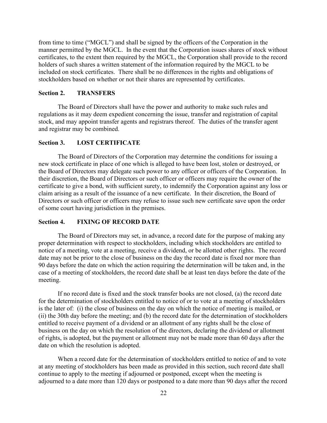 22 from time to time (“MGCL”) and shall be signed by the officers of the Corporation in the manner permitted by the MGCL. In the event that the Corporation issues shares of stock without certificates, to the extent then required by the MGCL, the Corporation shall provide to the record holders of such shares a written statement of the information required by the MGCL to be included on stock certificates. There shall be no differences in the rights and obligations of stockholders based on whether or not their shares are represented by certificates. Section 2. TRANSFERS The Board of Directors shall have the power and authority to make such rules and regulations as it may deem expedient concerning the issue, transfer and registration of capital stock, and may appoint transfer agents and registrars thereof. The duties of the transfer agent and registrar may be combined. Section 3. LOST CERTIFICATE The Board of Directors of the Corporation may determine the conditions for issuing a new stock certificate in place of one which is alleged to have been lost, stolen or destroyed, or the Board of Directors may delegate such power to any officer or officers of the Corporation. In their discretion, the Board of Directors or such officer or officers may require the owner of the certificate to give a bond, with sufficient surety, to indemnify the Corporation against any loss or claim arising as a result of the issuance of a new certificate. In their discretion, the Board of Directors or such officer or officers may refuse to issue such new certificate save upon the order of some court having jurisdiction in the premises. Section 4. FIXING OF RECORD DATE The Board of Directors may set, in advance, a record date for the purpose of making any proper determination with respect to stockholders, including which stockholders are entitled to notice of a meeting, vote at a meeting, receive a dividend, or be allotted other rights. The record date may not be prior to the close of business on the day the record date is fixed nor more than 90 days before the date on which the action requiring the determination will be taken and, in the case of a meeting of stockholders, the record date shall be at least ten days before the date of the meeting. If no record date is fixed and the stock transfer books are not closed, (a) the record date for the determination of stockholders entitled to notice of or to vote at a meeting of stockholders is the later of: (i) the close of business on the day on which the notice of meeting is mailed, or (ii) the 30th day before the meeting; and (b) the record date for the determination of stockholders entitled to receive payment of a dividend or an allotment of any rights shall be the close of business on the day on which the resolution of the directors, declaring the dividend or allotment of rights, is adopted, but the payment or allotment may not be made more than 60 days after the date on which the resolution is adopted. When a record date for the determination of stockholders entitled to notice of and to vote at any meeting of stockholders has been made as provided in this section, such record date shall continue to apply to the meeting if adjourned or postponed, except when the meeting is adjourned to a date more than 120 days or postponed to a date more than 90 days after the record