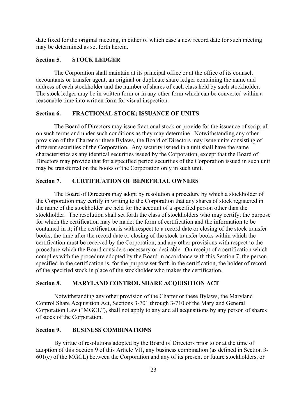 23 date fixed for the original meeting, in either of which case a new record date for such meeting may be determined as set forth herein. Section 5. STOCK LEDGER The Corporation shall maintain at its principal office or at the office of its counsel, accountants or transfer agent, an original or duplicate share ledger containing the name and address of each stockholder and the number of shares of each class held by such stockholder. The stock ledger may be in written form or in any other form which can be converted within a reasonable time into written form for visual inspection. Section 6. FRACTIONAL STOCK; ISSUANCE OF UNITS The Board of Directors may issue fractional stock or provide for the issuance of scrip, all on such terms and under such conditions as they may determine. Notwithstanding any other provision of the Charter or these Bylaws, the Board of Directors may issue units consisting of different securities of the Corporation. Any security issued in a unit shall have the same characteristics as any identical securities issued by the Corporation, except that the Board of Directors may provide that for a specified period securities of the Corporation issued in such unit may be transferred on the books of the Corporation only in such unit. Section 7. CERTIFICATION OF BENEFICIAL OWNERS The Board of Directors may adopt by resolution a procedure by which a stockholder of the Corporation may certify in writing to the Corporation that any shares of stock registered in the name of the stockholder are held for the account of a specified person other than the stockholder. The resolution shall set forth the class of stockholders who may certify; the purpose for which the certification may be made; the form of certification and the information to be contained in it; if the certification is with respect to a record date or closing of the stock transfer books, the time after the record date or closing of the stock transfer books within which the certification must be received by the Corporation; and any other provisions with respect to the procedure which the Board considers necessary or desirable. On receipt of a certification which complies with the procedure adopted by the Board in accordance with this Section 7, the person specified in the certification is, for the purpose set forth in the certification, the holder of record of the specified stock in place of the stockholder who makes the certification. Section 8. MARYLAND CONTROL SHARE ACQUISITION ACT Notwithstanding any other provision of the Charter or these Bylaws, the Maryland Control Share Acquisition Act, Sections 3-701 through 3-710 of the Maryland General Corporation Law (“MGCL”), shall not apply to any and all acquisitions by any person of shares of stock of the Corporation. Section 9. BUSINESS COMBINATIONS By virtue of resolutions adopted by the Board of Directors prior to or at the time of adoption of this Section 9 of this Article VII, any business combination (as defined in Section 3- 601(e) of the MGCL) between the Corporation and any of its present or future stockholders, or