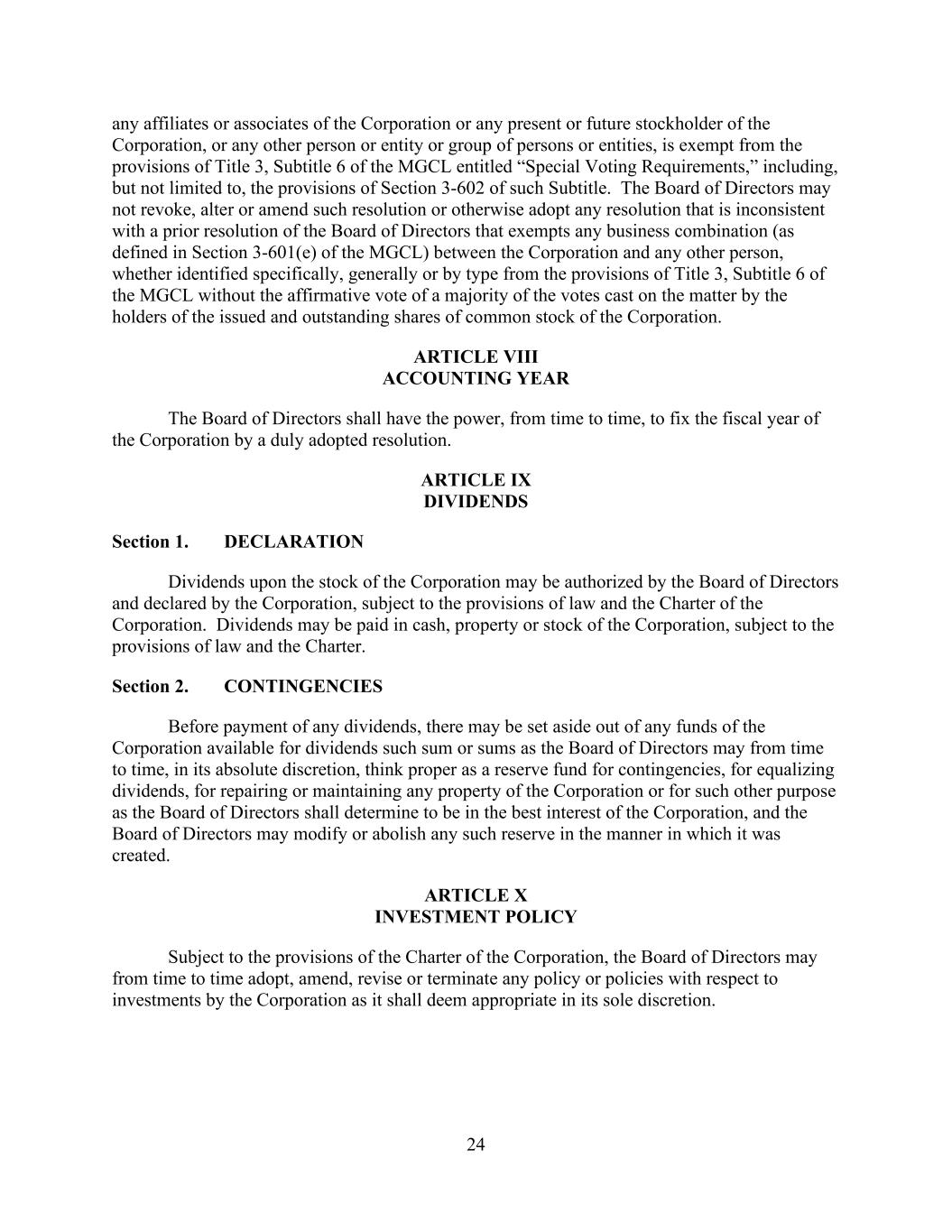 24 any affiliates or associates of the Corporation or any present or future stockholder of the Corporation, or any other person or entity or group of persons or entities, is exempt from the provisions of Title 3, Subtitle 6 of the MGCL entitled “Special Voting Requirements,” including, but not limited to, the provisions of Section 3-602 of such Subtitle. The Board of Directors may not revoke, alter or amend such resolution or otherwise adopt any resolution that is inconsistent with a prior resolution of the Board of Directors that exempts any business combination (as defined in Section 3-601(e) of the MGCL) between the Corporation and any other person, whether identified specifically, generally or by type from the provisions of Title 3, Subtitle 6 of the MGCL without the affirmative vote of a majority of the votes cast on the matter by the holders of the issued and outstanding shares of common stock of the Corporation. ARTICLE VIII ACCOUNTING YEAR The Board of Directors shall have the power, from time to time, to fix the fiscal year of the Corporation by a duly adopted resolution. ARTICLE IX DIVIDENDS Section 1. DECLARATION Dividends upon the stock of the Corporation may be authorized by the Board of Directors and declared by the Corporation, subject to the provisions of law and the Charter of the Corporation. Dividends may be paid in cash, property or stock of the Corporation, subject to the provisions of law and the Charter. Section 2. CONTINGENCIES Before payment of any dividends, there may be set aside out of any funds of the Corporation available for dividends such sum or sums as the Board of Directors may from time to time, in its absolute discretion, think proper as a reserve fund for contingencies, for equalizing dividends, for repairing or maintaining any property of the Corporation or for such other purpose as the Board of Directors shall determine to be in the best interest of the Corporation, and the Board of Directors may modify or abolish any such reserve in the manner in which it was created. ARTICLE X INVESTMENT POLICY Subject to the provisions of the Charter of the Corporation, the Board of Directors may from time to time adopt, amend, revise or terminate any policy or policies with respect to investments by the Corporation as it shall deem appropriate in its sole discretion.