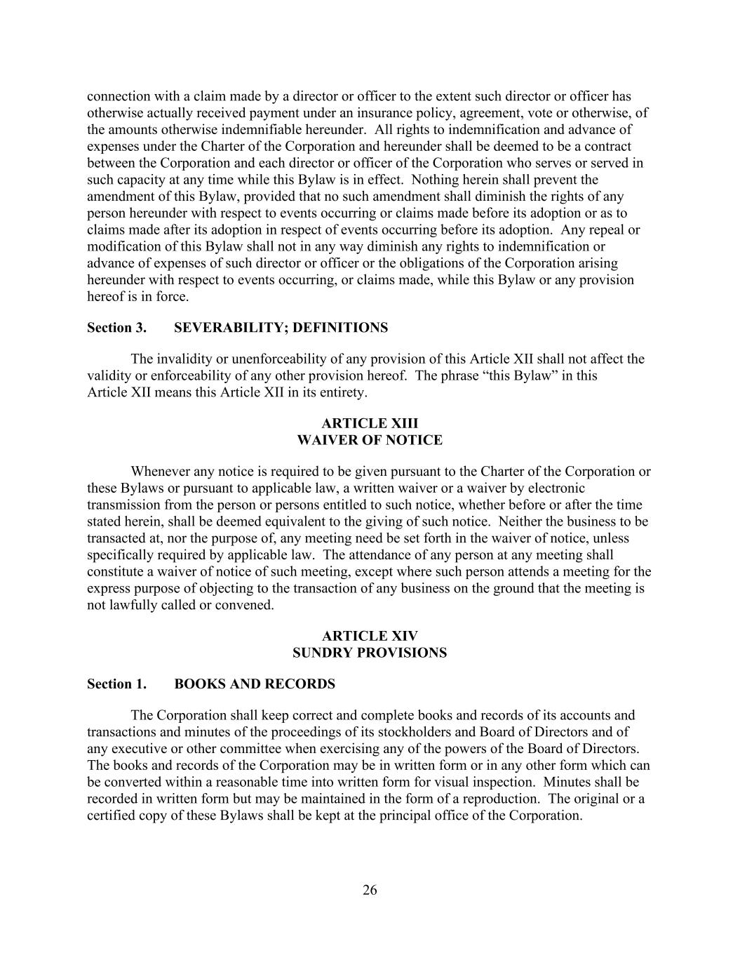 26 connection with a claim made by a director or officer to the extent such director or officer has otherwise actually received payment under an insurance policy, agreement, vote or otherwise, of the amounts otherwise indemnifiable hereunder. All rights to indemnification and advance of expenses under the Charter of the Corporation and hereunder shall be deemed to be a contract between the Corporation and each director or officer of the Corporation who serves or served in such capacity at any time while this Bylaw is in effect. Nothing herein shall prevent the amendment of this Bylaw, provided that no such amendment shall diminish the rights of any person hereunder with respect to events occurring or claims made before its adoption or as to claims made after its adoption in respect of events occurring before its adoption. Any repeal or modification of this Bylaw shall not in any way diminish any rights to indemnification or advance of expenses of such director or officer or the obligations of the Corporation arising hereunder with respect to events occurring, or claims made, while this Bylaw or any provision hereof is in force. Section 3. SEVERABILITY; DEFINITIONS The invalidity or unenforceability of any provision of this Article XII shall not affect the validity or enforceability of any other provision hereof. The phrase “this Bylaw” in this Article XII means this Article XII in its entirety. ARTICLE XIII WAIVER OF NOTICE Whenever any notice is required to be given pursuant to the Charter of the Corporation or these Bylaws or pursuant to applicable law, a written waiver or a waiver by electronic transmission from the person or persons entitled to such notice, whether before or after the time stated herein, shall be deemed equivalent to the giving of such notice. Neither the business to be transacted at, nor the purpose of, any meeting need be set forth in the waiver of notice, unless specifically required by applicable law. The attendance of any person at any meeting shall constitute a waiver of notice of such meeting, except where such person attends a meeting for the express purpose of objecting to the transaction of any business on the ground that the meeting is not lawfully called or convened. ARTICLE XIV SUNDRY PROVISIONS Section 1. BOOKS AND RECORDS The Corporation shall keep correct and complete books and records of its accounts and transactions and minutes of the proceedings of its stockholders and Board of Directors and of any executive or other committee when exercising any of the powers of the Board of Directors. The books and records of the Corporation may be in written form or in any other form which can be converted within a reasonable time into written form for visual inspection. Minutes shall be recorded in written form but may be maintained in the form of a reproduction. The original or a certified copy of these Bylaws shall be kept at the principal office of the Corporation.