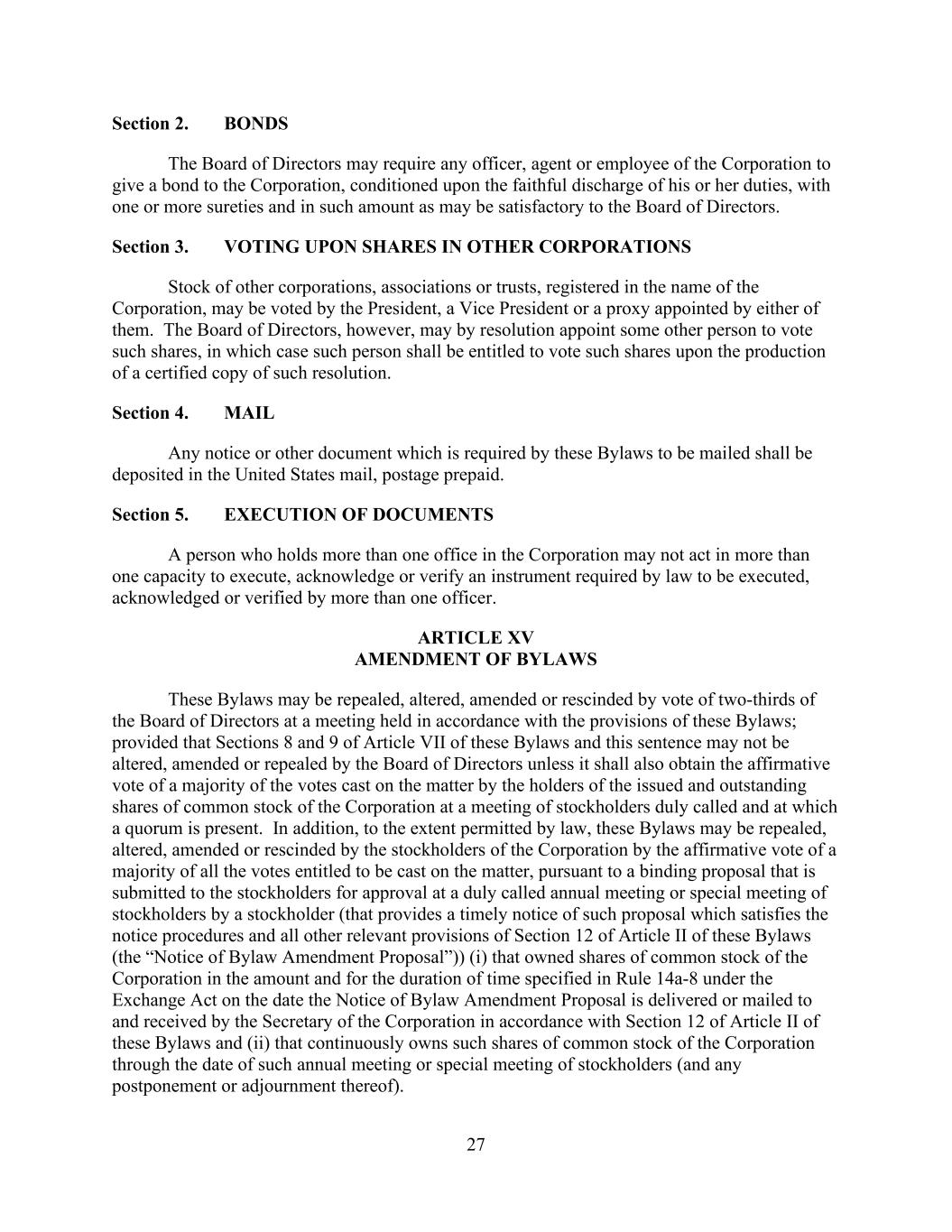 27 Section 2. BONDS The Board of Directors may require any officer, agent or employee of the Corporation to give a bond to the Corporation, conditioned upon the faithful discharge of his or her duties, with one or more sureties and in such amount as may be satisfactory to the Board of Directors. Section 3. VOTING UPON SHARES IN OTHER CORPORATIONS Stock of other corporations, associations or trusts, registered in the name of the Corporation, may be voted by the President, a Vice President or a proxy appointed by either of them. The Board of Directors, however, may by resolution appoint some other person to vote such shares, in which case such person shall be entitled to vote such shares upon the production of a certified copy of such resolution. Section 4. MAIL Any notice or other document which is required by these Bylaws to be mailed shall be deposited in the United States mail, postage prepaid. Section 5. EXECUTION OF DOCUMENTS A person who holds more than one office in the Corporation may not act in more than one capacity to execute, acknowledge or verify an instrument required by law to be executed, acknowledged or verified by more than one officer. ARTICLE XV AMENDMENT OF BYLAWS These Bylaws may be repealed, altered, amended or rescinded by vote of two-thirds of the Board of Directors at a meeting held in accordance with the provisions of these Bylaws; provided that Sections 8 and 9 of Article VII of these Bylaws and this sentence may not be altered, amended or repealed by the Board of Directors unless it shall also obtain the affirmative vote of a majority of the votes cast on the matter by the holders of the issued and outstanding shares of common stock of the Corporation at a meeting of stockholders duly called and at which a quorum is present. In addition, to the extent permitted by law, these Bylaws may be repealed, altered, amended or rescinded by the stockholders of the Corporation by the affirmative vote of a majority of all the votes entitled to be cast on the matter, pursuant to a binding proposal that is submitted to the stockholders for approval at a duly called annual meeting or special meeting of stockholders by a stockholder (that provides a timely notice of such proposal which satisfies the notice procedures and all other relevant provisions of Section 12 of Article II of these Bylaws (the “Notice of Bylaw Amendment Proposal”)) (i) that owned shares of common stock of the Corporation in the amount and for the duration of time specified in Rule 14a-8 under the Exchange Act on the date the Notice of Bylaw Amendment Proposal is delivered or mailed to and received by the Secretary of the Corporation in accordance with Section 12 of Article II of these Bylaws and (ii) that continuously owns such shares of common stock of the Corporation through the date of such annual meeting or special meeting of stockholders (and any postponement or adjournment thereof).