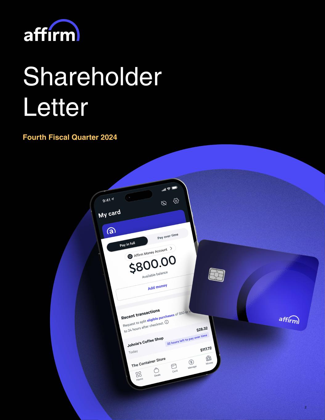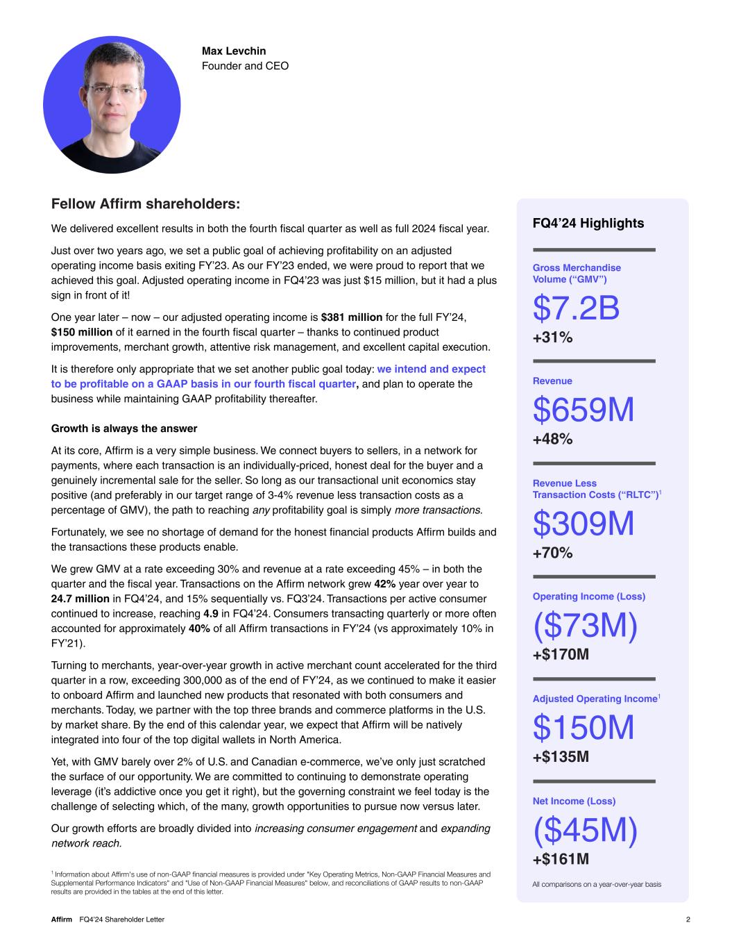 Fellow Affirm shareholders: We delivered excellent results in both the fourth fiscal quarter as well as full 2024 fiscal year. Just over two years ago, we set a public goal of achieving profitability on an adjusted operating income basis exiting FY’23. As our FY’23 ended, we were proud to report that we achieved this goal. Adjusted operating income in FQ4’23 was just $15 million, but it had a plus sign in front of it! One year later – now – our adjusted operating income is $381 million for the full FY’24, $150 million of it earned in the fourth fiscal quarter – thanks to continued product improvements, merchant growth, attentive risk management, and excellent capital execution. It is therefore only appropriate that we set another public goal today: we intend and expect to be profitable on a GAAP basis in our fourth fiscal quarter, and plan to operate the business while maintaining GAAP profitability thereafter. Growth is always the answer At its core, Affirm is a very simple business. We connect buyers to sellers, in a network for payments, where each transaction is an individually-priced, honest deal for the buyer and a genuinely incremental sale for the seller. So long as our transactional unit economics stay positive (and preferably in our target range of 3-4% revenue less transaction costs as a percentage of GMV), the path to reaching any profitability goal is simply more transactions. Fortunately, we see no shortage of demand for the honest financial products Affirm builds and the transactions these products enable. We grew GMV at a rate exceeding 30% and revenue at a rate exceeding 45% – in both the quarter and the fiscal year. Transactions on the Affirm network grew 42% year over year to 24.7 million in FQ4’24, and 15% sequentially vs. FQ3’24. Transactions per active consumer continued to increase, reaching 4.9 in FQ4’24. Consumers transacting quarterly or more often accounted for approximately 40% of all Affirm transactions in FY’24 (vs approximately 10% in FY’21). Turning to merchants, year-over-year growth in active merchant count accelerated for the third quarter in a row, exceeding 300,000 as of the end of FY’24, as we continued to make it easier to onboard Affirm and launched new products that resonated with both consumers and merchants. Today, we partner with the top three brands and commerce platforms in the U.S. by market share. By the end of this calendar year, we expect that Affirm will be natively integrated into four of the top digital wallets in North America. Yet, with GMV barely over 2% of U.S. and Canadian e-commerce, we’ve only just scratched the surface of our opportunity. We are committed to continuing to demonstrate operating leverage (it’s addictive once you get it right), but the governing constraint we feel today is the challenge of selecting which, of the many, growth opportunities to pursue now versus later. Our growth efforts are broadly divided into increasing consumer engagement and expanding network reach. Max Levchin Founder and CEO Gross Merchandise Volume (“GMV”) $7.2B +31% Revenue $659M +48% Revenue Less Transaction Costs (“RLTC”)1 $309M +70% Operating Income (Loss) ($73M) +$170M Adjusted Operating Income1 $150M +$135M Net Income (Loss) ($45M) +$161M All comparisons on a year-over-year basis 2Affirm FQ4’24 Shareholder Letter 1 Information about Affirm's use of non-GAAP financial measures is provided under "Key Operating Metrics, Non-GAAP Financial Measures and Supplemental Performance Indicators" and "Use of Non-GAAP Financial Measures" below, and reconciliations of GAAP results to non-GAAP results are provided in the tables at the end of this letter. FQ4’24 Highlights