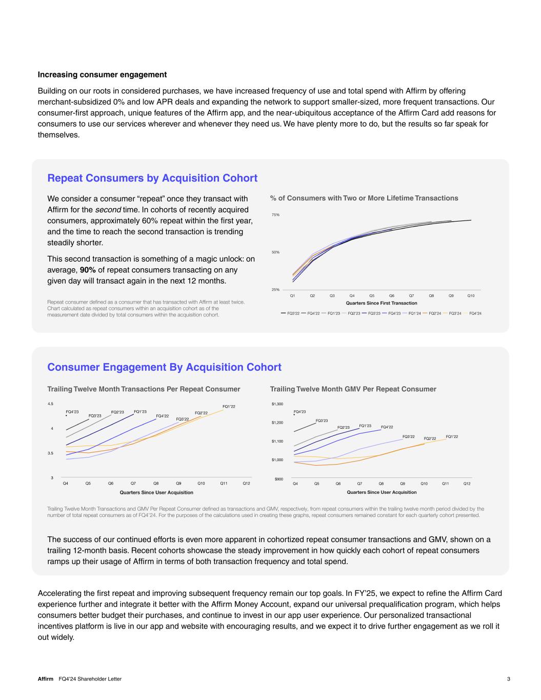 Trailing Twelve Month Transactions and GMV Per Repeat Consumer defined as transactions or GMV from repeat consumers within the trailing twelve month period at measurement divided by the number of repeat consumers. Increasing consumer engagement Building on our roots in considered purchases, we have increased frequency of use and total spend with Affirm by offering merchant-subsidized 0% and low APR deals and expanding the network to support smaller-sized, more frequent transactions. Our consumer-first approach, unique features of the Affirm app, and the near-ubiquitous acceptance of the Affirm Card add reasons for consumers to use our services wherever and whenever they need us. We have plenty more to do, but the results so far speak for themselves. TBD… 3Affirm FQ4’24 Shareholder Letter Consumer Engagement By Acquisition Cohort The success of our continued efforts is even more apparent in cohortized repeat consumer transactions and GMV, shown on a trailing 12-month basis. Recent cohorts showcase the steady improvement in how quickly each cohort of repeat consumers ramps up their usage of Affirm in terms of both transaction frequency and total spend. Accelerating the first repeat and improving subsequent frequency remain our top goals. In FY’25, we expect to refine the Affirm Card experience further and integrate it better with the Affirm Money Account, expand our universal prequalification program, which helps consumers better budget their purchases, and continue to invest in our app user experience. Our personalized transactional incentives platform is live in our app and website with encouraging results, and we expect it to drive further engagement as we roll it out widely. Old language: We consider a consumer “repeat” once they transact with Affirm for the second time. In cohorts of recently acquired consumers, approximately 60% repeat within the first year, and the time to reach the second transaction is trending steadily shorter. This second transaction is something of a magic unlock: cohort retention of consumers that repeat within first twelve months is over 90%. Repeat Consumers by Acquisition Cohort Trailing Twelve Month Transactions Per Repeat Consumer Trailing Twelve Month GMV Per Repeat Consumer Repeat Consumer defined as a consumer that has transacted with Affirm at least twice. Chart calculated as Repeat Consumers within an acquisition cohort as of the measurement date divided by total consumers within the acquisition cohort. Repeat consumer defined as a consumer that has transacted with Affirm at least twice. Chart calculated as repeat consumers within an acquisition cohort as of the measurement date divided by total consumers within the acquisition cohort. Trailing Twelve Month Transactions and GMV Per Repeat Consumer defined as transactions and GMV, respectively, from repeat consumers within the trailing twelve month period divided by the number of total repeat consumers as of FQ4’24. For the purposes of the calculations used in creating these graphs, repeat consumers remained constant for each quarterly cohort presented. % of Consumers with Two or More Lifetime TransactionsWe consider a consumer “repeat” once they transact with Affirm for the second time. In cohorts of recently acquired consumers, approximately 60% repeat within the first year, and the time to reach the second transaction is trending steadily shorter. This second transaction is something of a magic unlock: on average, 90% of repeat consumers transacting on any given day will transact again in the next 12 months.