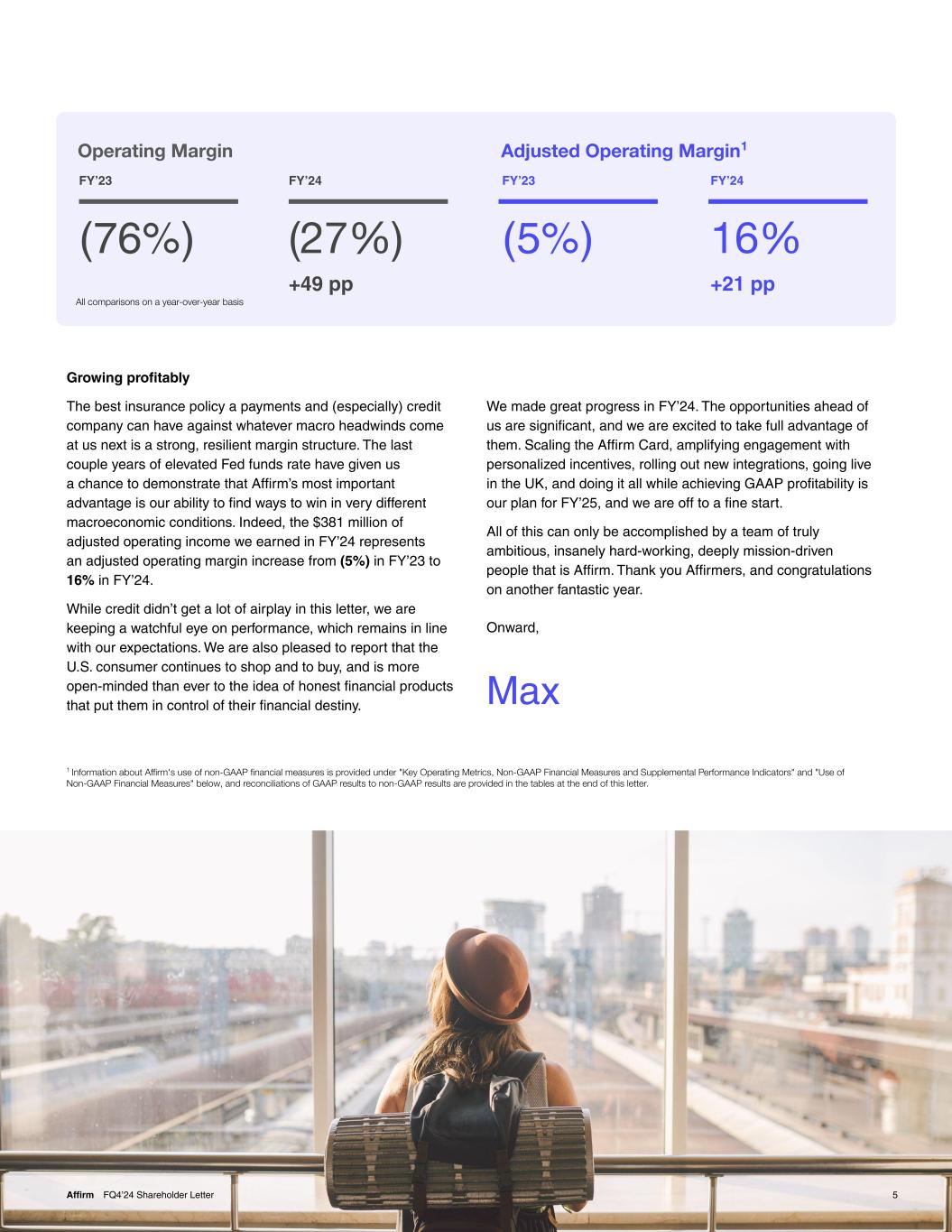 5Affirm FQ4’24 Shareholder Letter Growing profitably The best insurance policy a payments and (especially) credit company can have against whatever macro headwinds come at us next is a strong, resilient margin structure. The last couple years of elevated Fed funds rate have given us a chance to demonstrate that Affirm’s most important advantage is our ability to find ways to win in very different macroeconomic conditions. Indeed, the $381 million of adjusted operating income we earned in FY’24 represents an adjusted operating margin increase from (5%) in FY’23 to 16% in FY’24. While credit didn’t get a lot of airplay in this letter, we are keeping a watchful eye on performance, which remains in line with our expectations. We are also pleased to report that the U.S. consumer continues to shop and to buy, and is more open-minded than ever to the idea of honest financial products that put them in control of their financial destiny. We made great progress in FY’24. The opportunities ahead of us are significant, and we are excited to take full advantage of them. Scaling the Affirm Card, amplifying engagement with personalized incentives, rolling out new integrations, going live in the UK, and doing it all while achieving GAAP profitability is our plan for FY’25, and we are off to a fine start. All of this can only be accomplished by a team of truly ambitious, insanely hard-working, deeply mission-driven people that is Affirm. Thank you Affirmers, and congratulations on another fantastic year. Onward, Max 1 Information about Affirm's use of non-GAAP financial measures is provided under "Key Operating Metrics, Non-GAAP Financial Measures and Supplemental Performance Indicators" and "Use of Non-GAAP Financial Measures" below, and reconciliations of GAAP results to non-GAAP results are provided in the tables at the end of this letter. FY’23 (5%) FY’23 (76%) FY’24 (27%) +49 pp FY’24 16% +21 pp All comparisons on a year-over-year basis Operating Margin Adjusted Operating Margin1