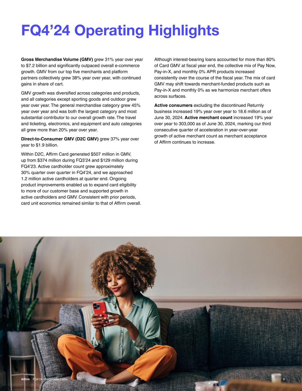 FQ4’24 Operating Highlights 6Affirm FQ4’24 Shareholder Letter Gross Merchandise Volume (GMV) grew 31% year over year to $7.2 billion and significantly outpaced overall e-commerce growth. GMV from our top five merchants and platform partners collectively grew 38% year over year, with continued gains in share of cart. GMV growth was diversified across categories and products, and all categories except sporting goods and outdoor grew year over year. The general merchandise category grew 45% year over year and was both the largest category and most substantial contributor to our overall growth rate. The travel and ticketing, electronics, and equipment and auto categories all grew more than 20% year over year. Direct-to-Consumer GMV (D2C GMV) grew 37% year over year to $1.9 billion. Within D2C, Affirm Card generated $507 million in GMV, up from $374 million during FQ3’24 and $129 million during FQ4’23. Active cardholder count grew approximately 30% quarter over quarter in FQ4’24, and we approached 1.2 million active cardholders at quarter end. Ongoing product improvements enabled us to expand card eligibility to more of our customer base and supported growth in active cardholders and GMV. Consistent with prior periods, card unit economics remained similar to that of Affirm overall. Although interest-bearing loans accounted for more than 80% of Card GMV at fiscal year end, the collective mix of Pay Now, Pay-in-X, and monthly 0% APR products increased consistently over the course of the fiscal year. The mix of card GMV may shift towards merchant-funded products such as Pay-in-X and monthly 0% as we harmonize merchant offers across surfaces. Active consumers excluding the discontinued Returnly business increased 19% year over year to 18.6 million as of June 30, 2024. Active merchant count increased 19% year over year to 303,000 as of June 30, 2024, marking our third consecutive quarter of acceleration in year-over-year growth of active merchant count as merchant acceptance of Affirm continues to increase.