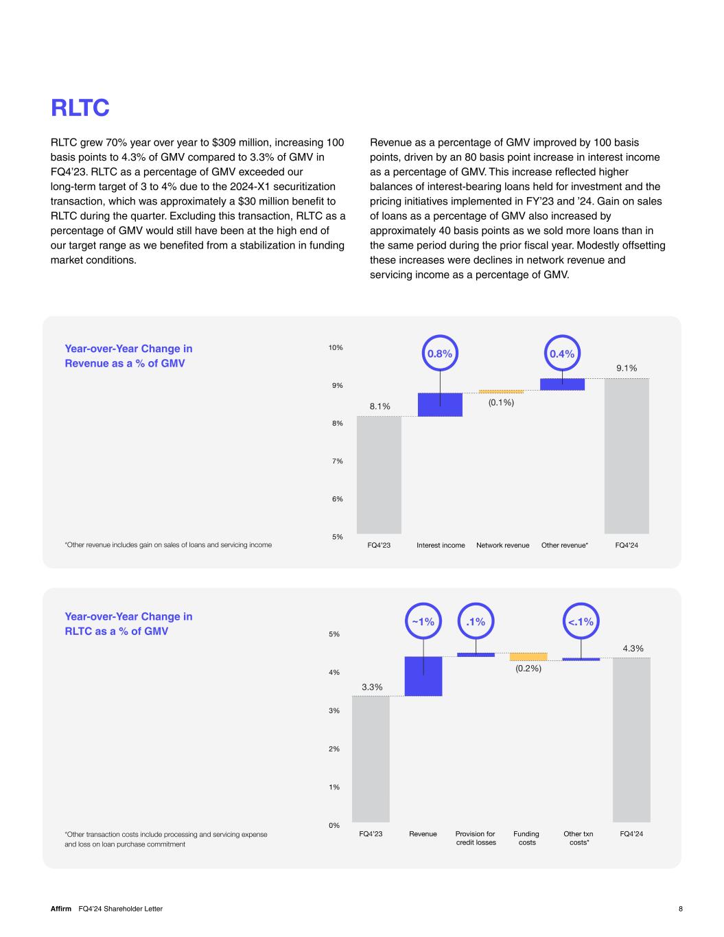 8Affirm FQ4’24 Shareholder Letter RLTC RLTC grew 70% year over year to $309 million, increasing 100 basis points to 4.3% of GMV compared to 3.3% of GMV in FQ4’23. RLTC as a percentage of GMV exceeded our long-term target of 3 to 4% due to the 2024-X1 securitization transaction, which was approximately a $30 million benefit to RLTC during the quarter. Excluding this transaction, RLTC as a percentage of GMV would still have been at the high end of our target range as we benefited from a stabilization in funding market conditions. Revenue as a percentage of GMV improved by 100 basis points, driven by an 80 basis point increase in interest income as a percentage of GMV. This increase reflected higher balances of interest-bearing loans held for investment and the pricing initiatives implemented in FY’23 and ’24. Gain on sales of loans as a percentage of GMV also increased by approximately 40 basis points as we sold more loans than in the same period during the prior fiscal year. Modestly offsetting these increases were declines in network revenue and servicing income as a percentage of GMV. *Other transaction costs include processing and servicing expense and loss on loan purchase commitment Year-over-Year Change in RLTC as a % of GMV Year-over-Year Change in Revenue as a % of GMV *Other revenue includes gain on sales of loans and servicing income