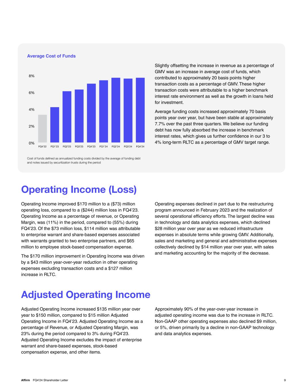 9Affirm FQ4’24 Shareholder Letter Operating Income (Loss) Operating Income improved $170 million to a ($73) million operating loss, compared to a ($244) million loss in FQ4’23. Operating Income as a percentage of revenue, or Operating Margin, was (11%) in the period, compared to (55%) during FQ4’23. Of the $73 million loss, $114 million was attributable to enterprise warrant and share-based expenses associated with warrants granted to two enterprise partners, and $65 million to employee stock-based compensation expense. The $170 million improvement in Operating Income was driven by a $43 million year-over-year reduction in other operating expenses excluding transaction costs and a $127 million increase in RLTC. Operating expenses declined in part due to the restructuring program announced in February 2023 and the realization of several operational efficiency efforts. The largest decline was in technology and data analytics expenses, which declined $28 million year over year as we reduced infrastructure expenses in absolute terms while growing GMV. Additionally, sales and marketing and general and administrative expenses collectively declined by $14 million year over year, with sales and marketing accounting for the majority of the decrease. Adjusted Operating Income Adjusted Operating Income increased $135 million year over year to $150 million, compared to $15 million Adjusted Operating Income in FQ4’23. Adjusted Operating Income as a percentage of Revenue, or Adjusted Operating Margin, was 23% during the period compared to 3% during FQ4’23. Adjusted Operating Income excludes the impact of enterprise warrant and share-based expenses, stock-based compensation expense, and other items. Approximately 90% of the year-over-year increase in adjusted operating income was due to the increase in RLTC. Non-GAAP other operating expenses also declined $9 million, or 5%, driven primarily by a decline in non-GAAP technology and data analytics expenses. Average Cost of Funds Slightly offsetting the increase in revenue as a percentage of GMV was an increase in average cost of funds, which contributed to approximately 20 basis points higher transaction costs as a percentage of GMV. These higher transaction costs were attributable to a higher benchmark interest rate environment as well as the growth in loans held for investment. Average funding costs increased approximately 70 basis points year over year, but have been stable at approximately 7.7% over the past three quarters. We believe our funding debt has now fully absorbed the increase in benchmark interest rates, which gives us further confidence in our 3 to 4% long-term RLTC as a percentage of GMV target range. Cost of funds defined as annualized funding costs divided by the average of funding debt and notes issued by securitization trusts during the period