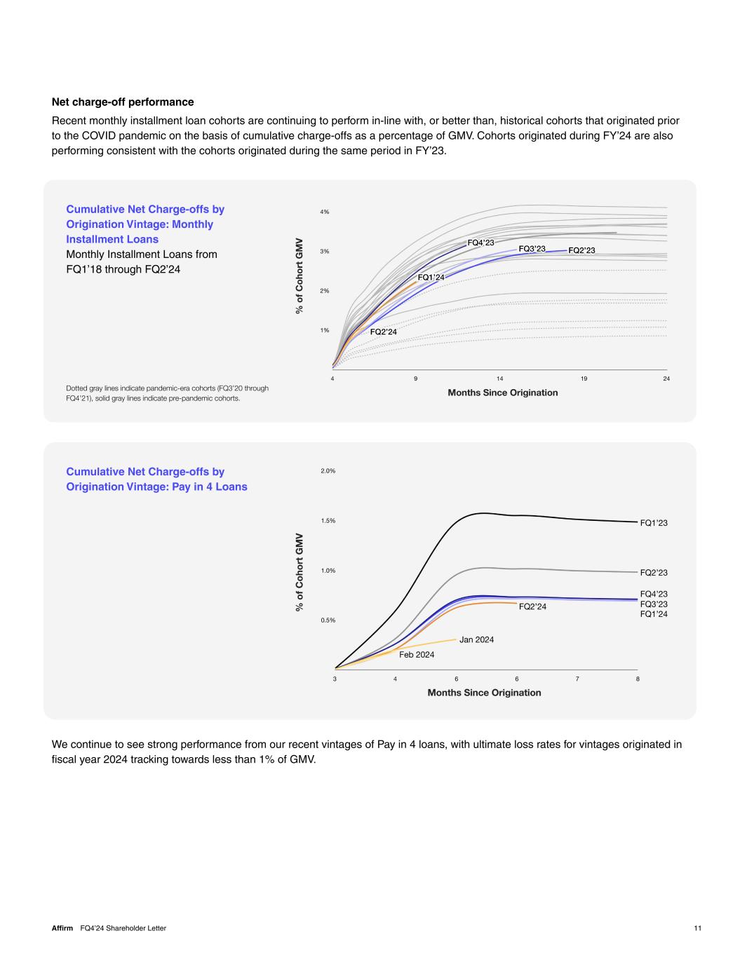 11Affirm FQ4’24 Shareholder Letter Cumulative Net Charge-offs by Origination Vintage: Monthly Installment Loans Monthly Installment Loans from FQ1’18 through FQ2’24 Dotted gray lines indicate pandemic-era cohorts (FQ3’20 through FQ4’21), solid gray lines indicate pre-pandemic cohorts. We continue to see strong performance from our recent vintages of Pay in 4 loans, with ultimate loss rates for vintages originated in fiscal year 2024 tracking towards less than 1% of GMV. Cumulative Net Charge-offs by Origination Vintage: Pay in 4 Loans Net charge-off performance Recent monthly installment loan cohorts are continuing to perform in-line with, or better than, historical cohorts that originated prior to the COVID pandemic on the basis of cumulative charge-offs as a percentage of GMV. Cohorts originated during FY’24 are also performing consistent with the cohorts originated during the same period in FY’23.