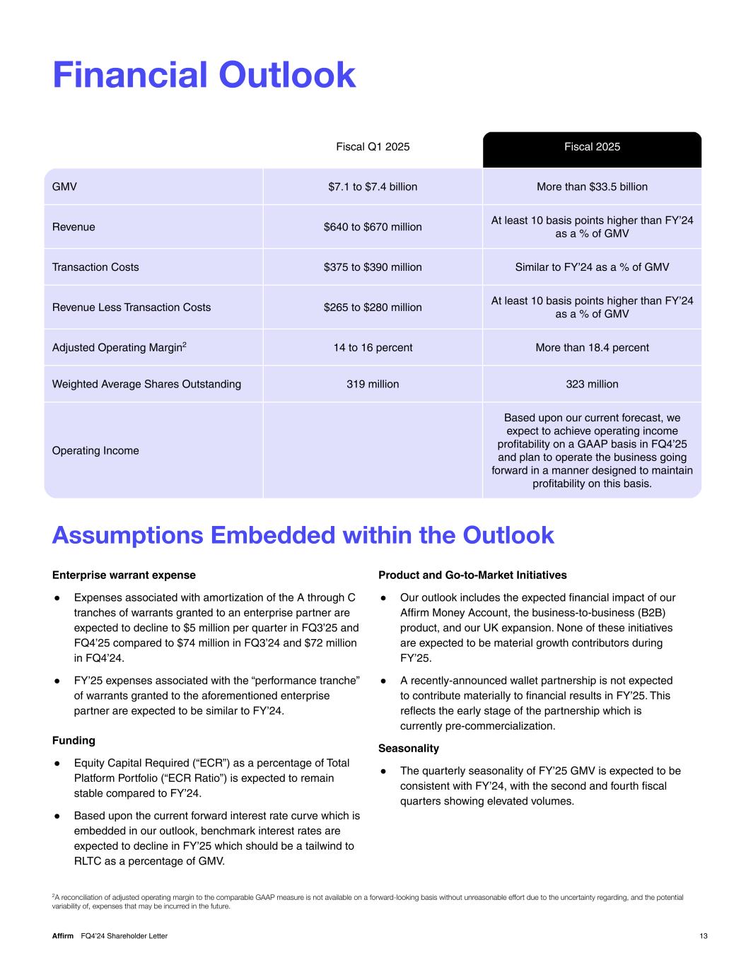 Financial Outlook 13Affirm FQ4’24 Shareholder Letter Assumptions Embedded within the Outlook Product and Go-to-Market Initiatives ● Our outlook includes the expected financial impact of our Affirm Money Account, the business-to-business (B2B) product, and our UK expansion. None of these initiatives are expected to be material growth contributors during FY’25. ● A recently-announced wallet partnership is not expected to contribute materially to financial results in FY’25. This reflects the early stage of the partnership which is currently pre-commercialization. Seasonality ● The quarterly seasonality of FY’25 GMV is expected to be consistent with FY’24, with the second and fourth fiscal quarters showing elevated volumes. Fiscal Q1 2025 Fiscal 2025 GMV $7.1 to $7.4 billion More than $33.5 billion Revenue $640 to $670 million At least 10 basis points higher than FY’24 as a % of GMV Transaction Costs $375 to $390 million Similar to FY’24 as a % of GMV Revenue Less Transaction Costs $265 to $280 million At least 10 basis points higher than FY’24 as a % of GMV Adjusted Operating Margin2 14 to 16 percent More than 18.4 percent Weighted Average Shares Outstanding 319 million 323 million Operating Income Based upon our current forecast, we expect to achieve operating income profitability on a GAAP basis in FQ4’25 and plan to operate the business going forward in a manner designed to maintain profitability on this basis. 2A reconciliation of adjusted operating margin to the comparable GAAP measure is not available on a forward-looking basis without unreasonable effort due to the uncertainty regarding, and the potential variability of, expenses that may be incurred in the future. Enterprise warrant expense ● Expenses associated with amortization of the A through C tranches of warrants granted to an enterprise partner are expected to decline to $5 million per quarter in FQ3’25 and FQ4’25 compared to $74 million in FQ3’24 and $72 million in FQ4’24. ● FY’25 expenses associated with the “performance tranche” of warrants granted to the aforementioned enterprise partner are expected to be similar to FY’24. Funding ● Equity Capital Required (“ECR”) as a percentage of Total Platform Portfolio (“ECR Ratio”) is expected to remain stable compared to FY’24. ● Based upon the current forward interest rate curve which is embedded in our outlook, benchmark interest rates are expected to decline in FY’25 which should be a tailwind to RLTC as a percentage of GMV.
