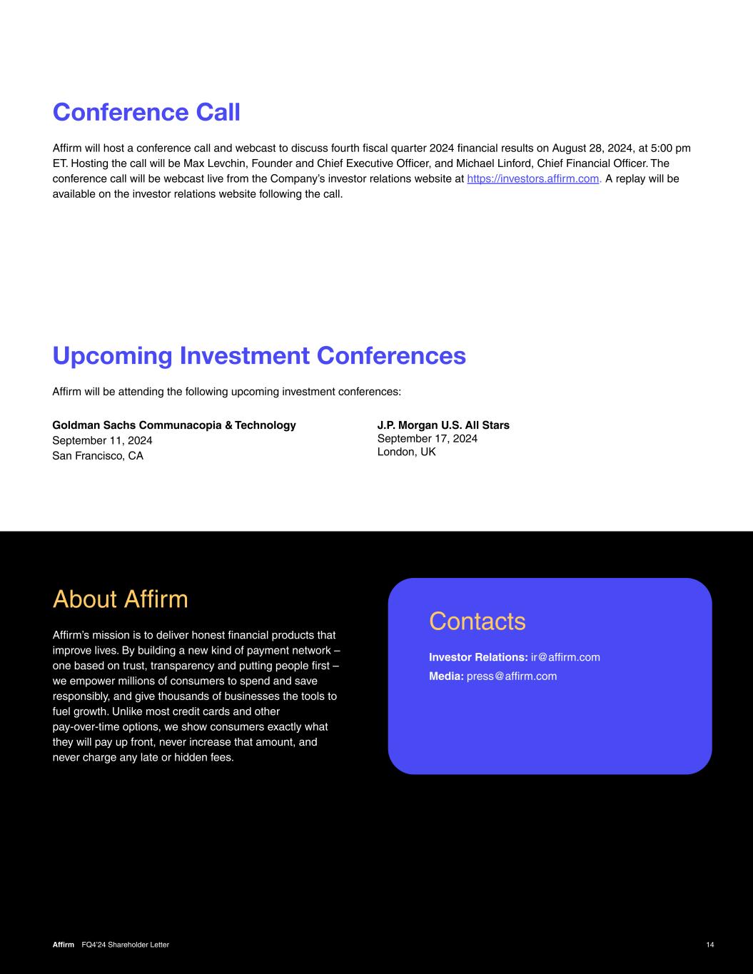 Conference Call 14Affirm FQ4’24 Shareholder Letter Affirm will host a conference call and webcast to discuss fourth fiscal quarter 2024 financial results on August 28, 2024, at 5:00 pm ET. Hosting the call will be Max Levchin, Founder and Chief Executive Officer, and Michael Linford, Chief Financial Officer. The conference call will be webcast live from the Company’s investor relations website at https://investors.affirm.com. A replay will be available on the investor relations website following the call. Upcoming Investment Conferences Affirm will be attending the following upcoming investment conferences: Goldman Sachs Communacopia & Technology September 11, 2024 San Francisco, CA J.P. Morgan U.S. All Stars September 17, 2024 London, UK About Affirm Affirm’s mission is to deliver honest financial products that improve lives. By building a new kind of payment network – one based on trust, transparency and putting people first – we empower millions of consumers to spend and save responsibly, and give thousands of businesses the tools to fuel growth. Unlike most credit cards and other pay-over-time options, we show consumers exactly what they will pay up front, never increase that amount, and never charge any late or hidden fees. Contacts Investor Relations: ir@affirm.com Media: press@affirm.com