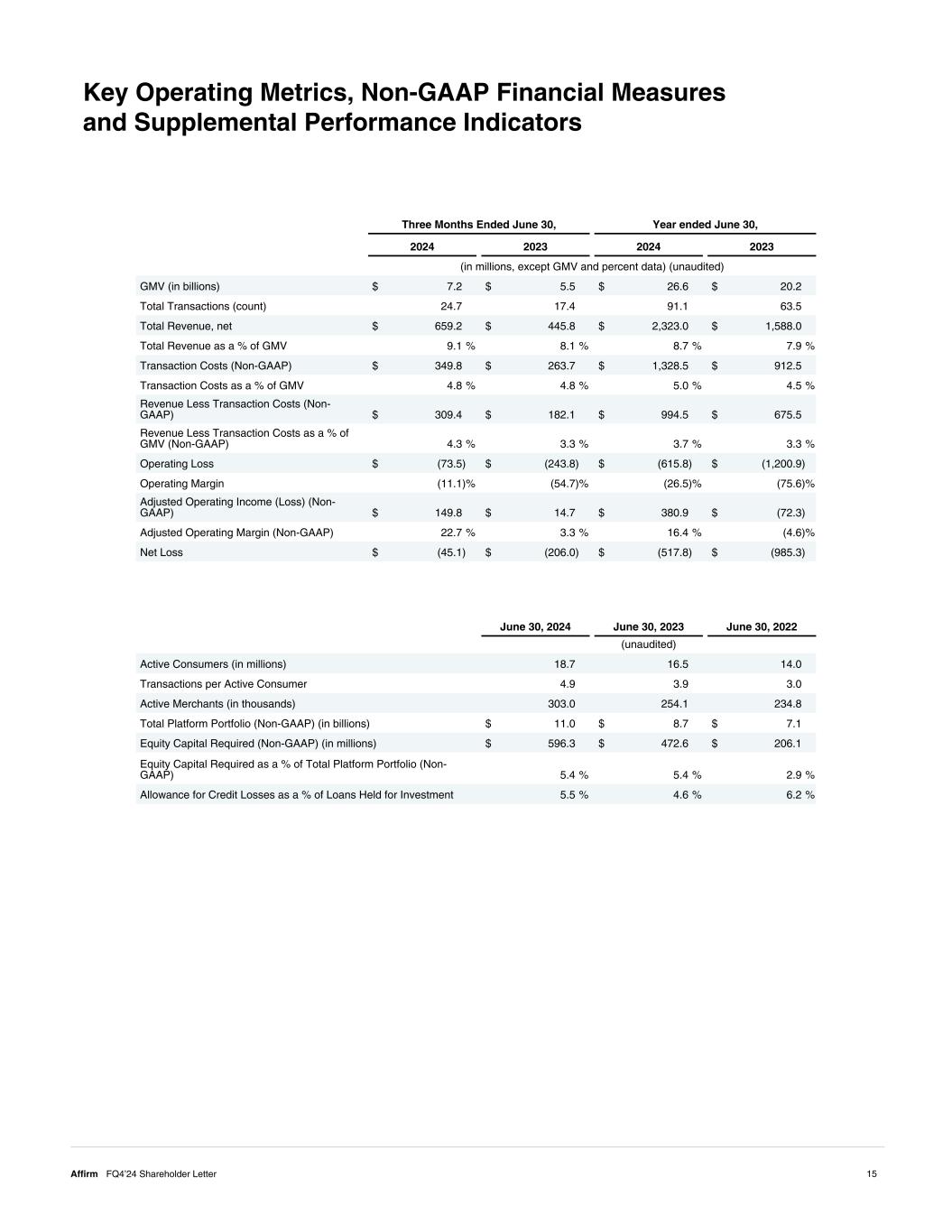 Three Months Ended June 30, Year ended June 30, 2024 2023 2024 2023 (in millions, except GMV and percent data) (unaudited) GMV (in billions) $ 7.2 $ 5.5 $ 26.6 $ 20.2 Total Transactions (count) 24.7 17.4 91.1 63.5 Total Revenue, net $ 659.2 $ 445.8 $ 2,323.0 $ 1,588.0 Total Revenue as a % of GMV 9.1 % 8.1 % 8.7 % 7.9 % Transaction Costs (Non-GAAP) $ 349.8 $ 263.7 $ 1,328.5 $ 912.5 Transaction Costs as a % of GMV 4.8 % 4.8 % 5.0 % 4.5 % Revenue Less Transaction Costs (Non- GAAP) $ 309.4 $ 182.1 $ 994.5 $ 675.5 Revenue Less Transaction Costs as a % of GMV (Non-GAAP) 4.3 % 3.3 % 3.7 % 3.3 % Operating Loss $ (73.5) $ (243.8) $ (615.8) $ (1,200.9) Operating Margin (11.1) % (54.7) % (26.5) % (75.6) % Adjusted Operating Income (Loss) (Non- GAAP) $ 149.8 $ 14.7 $ 380.9 $ (72.3) Adjusted Operating Margin (Non-GAAP) 22.7 % 3.3 % 16.4 % (4.6) % Net Loss $ (45.1) $ (206.0) $ (517.8) $ (985.3) Key Operating Metrics, Non-GAAP Financial Measures and Supplemental Performance Indicators June 30, 2024 June 30, 2023 June 30, 2022 (unaudited) Active Consumers (in millions) 18.7 16.5 14.0 Transactions per Active Consumer 4.9 3.9 3.0 Active Merchants (in thousands) 303.0 254.1 234.8 Total Platform Portfolio (Non-GAAP) (in billions) $ 11.0 $ 8.7 $ 7.1 Equity Capital Required (Non-GAAP) (in millions) $ 596.3 $ 472.6 $ 206.1 Equity Capital Required as a % of Total Platform Portfolio (Non- GAAP) 5.4 % 5.4 % 2.9 % Allowance for Credit Losses as a % of Loans Held for Investment 5.5 % 4.6 % 6.2 % 15Affirm FQ4’24 Shareholder Letter