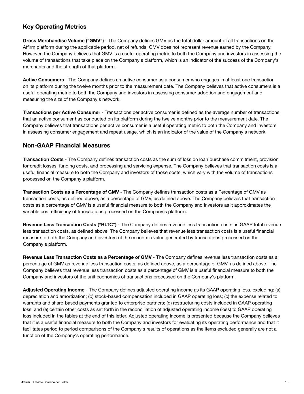 Key Operating Metrics Gross Merchandise Volume (“GMV”) - The Company defines GMV as the total dollar amount of all transactions on the Affirm platform during the applicable period, net of refunds. GMV does not represent revenue earned by the Company. However, the Company believes that GMV is a useful operating metric to both the Company and investors in assessing the volume of transactions that take place on the Company's platform, which is an indicator of the success of the Company's merchants and the strength of that platform. Active Consumers - The Company defines an active consumer as a consumer who engages in at least one transaction on its platform during the twelve months prior to the measurement date. The Company believes that active consumers is a useful operating metric to both the Company and investors in assessing consumer adoption and engagement and measuring the size of the Company's network. Transactions per Active Consumer - Transactions per active consumer is defined as the average number of transactions that an active consumer has conducted on its platform during the twelve months prior to the measurement date. The Company believes that transactions per active consumer is a useful operating metric to both the Company and investors in assessing consumer engagement and repeat usage, which is an indicator of the value of the Company's network. Non-GAAP Financial Measures Transaction Costs - The Company defines transaction costs as the sum of loss on loan purchase commitment, provision for credit losses, funding costs, and processing and servicing expense. The Company believes that transaction costs is a useful financial measure to both the Company and investors of those costs, which vary with the volume of transactions processed on the Company's platform. Transaction Costs as a Percentage of GMV - The Company defines transaction costs as a Percentage of GMV as transaction costs, as defined above, as a percentage of GMV, as defined above. The Company believes that transaction costs as a percentage of GMV is a useful financial measure to both the Company and investors as it approximates the variable cost efficiency of transactions processed on the Company's platform. Revenue Less Transaction Costs (“RLTC”) - The Company defines revenue less transaction costs as GAAP total revenue less transaction costs, as defined above. The Company believes that revenue less transaction costs is a useful financial measure to both the Company and investors of the economic value generated by transactions processed on the Company's platform. Revenue Less Transaction Costs as a Percentage of GMV - The Company defines revenue less transaction costs as a percentage of GMV as revenue less transaction costs, as defined above, as a percentage of GMV, as defined above. The Company believes that revenue less transaction costs as a percentage of GMV is a useful financial measure to both the Company and investors of the unit economics of transactions processed on the Company's platform. Adjusted Operating Income - The Company defines adjusted operating income as its GAAP operating loss, excluding: (a) depreciation and amortization; (b) stock-based compensation included in GAAP operating loss; (c) the expense related to warrants and share-based payments granted to enterprise partners; (d) restructuring costs included in GAAP operating loss; and (e) certain other costs as set forth in the reconciliation of adjusted operating income (loss) to GAAP operating loss included in the tables at the end of this letter. Adjusted operating income is presented because the Company believes that it is a useful financial measure to both the Company and investors for evaluating its operating performance and that it facilitates period to period comparisons of the Company's results of operations as the items excluded generally are not a function of the Company's operating performance. 16Affirm FQ4’24 Shareholder Letter