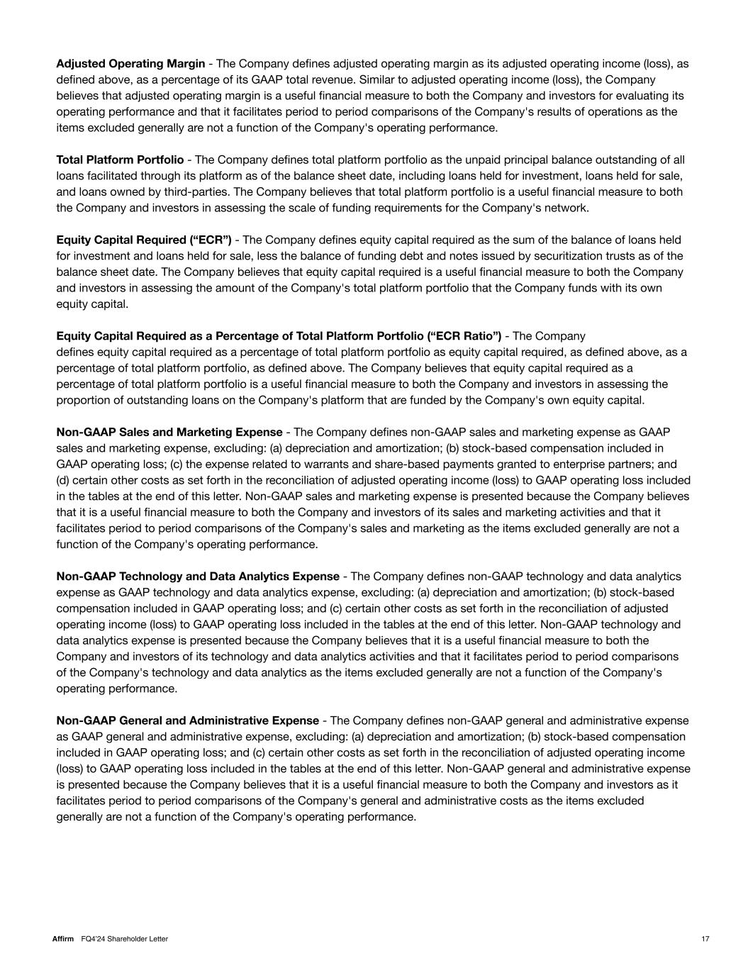 Adjusted Operating Margin - The Company defines adjusted operating margin as its adjusted operating income (loss), as defined above, as a percentage of its GAAP total revenue. Similar to adjusted operating income (loss), the Company believes that adjusted operating margin is a useful financial measure to both the Company and investors for evaluating its operating performance and that it facilitates period to period comparisons of the Company's results of operations as the items excluded generally are not a function of the Company's operating performance. Total Platform Portfolio - The Company defines total platform portfolio as the unpaid principal balance outstanding of all loans facilitated through its platform as of the balance sheet date, including loans held for investment, loans held for sale, and loans owned by third-parties. The Company believes that total platform portfolio is a useful financial measure to both the Company and investors in assessing the scale of funding requirements for the Company's network. Equity Capital Required (“ECR”) - The Company defines equity capital required as the sum of the balance of loans held for investment and loans held for sale, less the balance of funding debt and notes issued by securitization trusts as of the balance sheet date. The Company believes that equity capital required is a useful financial measure to both the Company and investors in assessing the amount of the Company's total platform portfolio that the Company funds with its own equity capital. Equity Capital Required as a Percentage of Total Platform Portfolio (“ECR Ratio”) - The Company defines equity capital required as a percentage of total platform portfolio as equity capital required, as defined above, as a percentage of total platform portfolio, as defined above. The Company believes that equity capital required as a percentage of total platform portfolio is a useful financial measure to both the Company and investors in assessing the proportion of outstanding loans on the Company's platform that are funded by the Company's own equity capital. Non-GAAP Sales and Marketing Expense - The Company defines non-GAAP sales and marketing expense as GAAP sales and marketing expense, excluding: (a) depreciation and amortization; (b) stock-based compensation included in GAAP operating loss; (c) the expense related to warrants and share-based payments granted to enterprise partners; and (d) certain other costs as set forth in the reconciliation of adjusted operating income (loss) to GAAP operating loss included in the tables at the end of this letter. Non-GAAP sales and marketing expense is presented because the Company believes that it is a useful financial measure to both the Company and investors of its sales and marketing activities and that it facilitates period to period comparisons of the Company's sales and marketing as the items excluded generally are not a function of the Company's operating performance. Non-GAAP Technology and Data Analytics Expense - The Company defines non-GAAP technology and data analytics expense as GAAP technology and data analytics expense, excluding: (a) depreciation and amortization; (b) stock-based compensation included in GAAP operating loss; and (c) certain other costs as set forth in the reconciliation of adjusted operating income (loss) to GAAP operating loss included in the tables at the end of this letter. Non-GAAP technology and data analytics expense is presented because the Company believes that it is a useful financial measure to both the Company and investors of its technology and data analytics activities and that it facilitates period to period comparisons of the Company's technology and data analytics as the items excluded generally are not a function of the Company's operating performance. Non-GAAP General and Administrative Expense - The Company defines non-GAAP general and administrative expense as GAAP general and administrative expense, excluding: (a) depreciation and amortization; (b) stock-based compensation included in GAAP operating loss; and (c) certain other costs as set forth in the reconciliation of adjusted operating income (loss) to GAAP operating loss included in the tables at the end of this letter. Non-GAAP general and administrative expense is presented because the Company believes that it is a useful financial measure to both the Company and investors as it facilitates period to period comparisons of the Company's general and administrative costs as the items excluded generally are not a function of the Company's operating performance. 17Affirm FQ4’24 Shareholder Letter