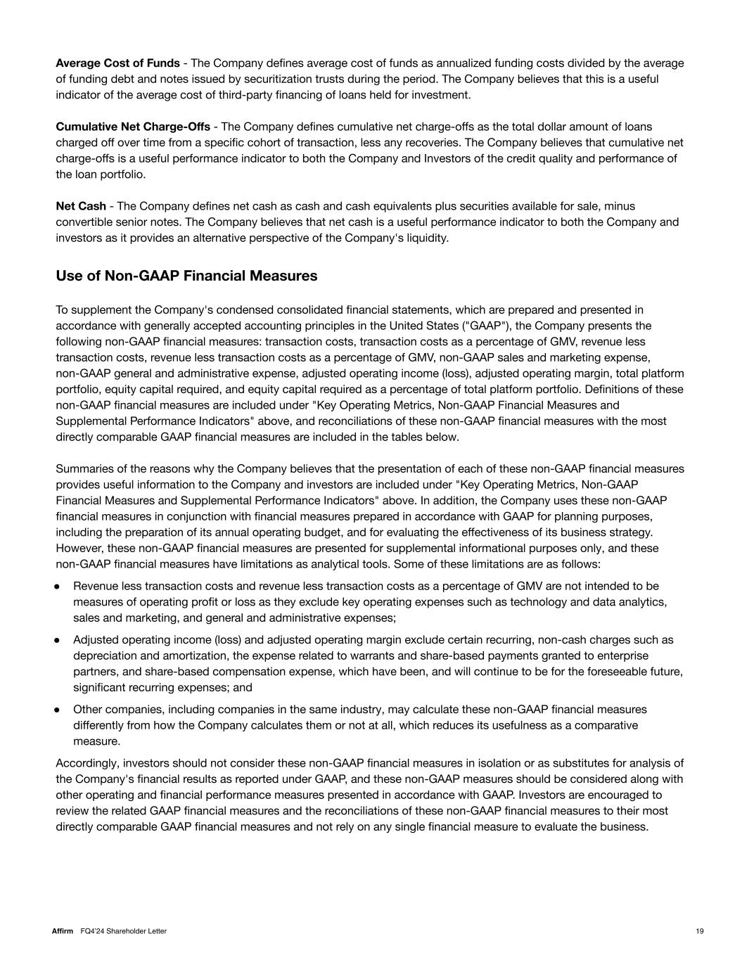 Average Cost of Funds - The Company defines average cost of funds as annualized funding costs divided by the average of funding debt and notes issued by securitization trusts during the period. The Company believes that this is a useful indicator of the average cost of third-party financing of loans held for investment. Cumulative Net Charge-Offs - The Company defines cumulative net charge-offs as the total dollar amount of loans charged off over time from a specific cohort of transaction, less any recoveries. The Company believes that cumulative net charge-offs is a useful performance indicator to both the Company and Investors of the credit quality and performance of the loan portfolio. Net Cash - The Company defines net cash as cash and cash equivalents plus securities available for sale, minus convertible senior notes. The Company believes that net cash is a useful performance indicator to both the Company and investors as it provides an alternative perspective of the Company's liquidity. Use of Non-GAAP Financial Measures To supplement the Company's condensed consolidated financial statements, which are prepared and presented in accordance with generally accepted accounting principles in the United States ("GAAP"), the Company presents the following non-GAAP financial measures: transaction costs, transaction costs as a percentage of GMV, revenue less transaction costs, revenue less transaction costs as a percentage of GMV, non-GAAP sales and marketing expense, non-GAAP general and administrative expense, adjusted operating income (loss), adjusted operating margin, total platform portfolio, equity capital required, and equity capital required as a percentage of total platform portfolio. Definitions of these non-GAAP financial measures are included under "Key Operating Metrics, Non-GAAP Financial Measures and Supplemental Performance Indicators" above, and reconciliations of these non-GAAP financial measures with the most directly comparable GAAP financial measures are included in the tables below. Summaries of the reasons why the Company believes that the presentation of each of these non-GAAP financial measures provides useful information to the Company and investors are included under "Key Operating Metrics, Non-GAAP Financial Measures and Supplemental Performance Indicators" above. In addition, the Company uses these non-GAAP financial measures in conjunction with financial measures prepared in accordance with GAAP for planning purposes, including the preparation of its annual operating budget, and for evaluating the effectiveness of its business strategy. However, these non-GAAP financial measures are presented for supplemental informational purposes only, and these non-GAAP financial measures have limitations as analytical tools. Some of these limitations are as follows: ● Revenue less transaction costs and revenue less transaction costs as a percentage of GMV are not intended to be measures of operating profit or loss as they exclude key operating expenses such as technology and data analytics, sales and marketing, and general and administrative expenses; ● Adjusted operating income (loss) and adjusted operating margin exclude certain recurring, non-cash charges such as depreciation and amortization, the expense related to warrants and share-based payments granted to enterprise partners, and share-based compensation expense, which have been, and will continue to be for the foreseeable future, significant recurring expenses; and ● Other companies, including companies in the same industry, may calculate these non-GAAP financial measures differently from how the Company calculates them or not at all, which reduces its usefulness as a comparative measure. Accordingly, investors should not consider these non-GAAP financial measures in isolation or as substitutes for analysis of the Company's financial results as reported under GAAP, and these non-GAAP measures should be considered along with other operating and financial performance measures presented in accordance with GAAP. Investors are encouraged to review the related GAAP financial measures and the reconciliations of these non-GAAP financial measures to their most directly comparable GAAP financial measures and not rely on any single financial measure to evaluate the business. 19Affirm FQ4’24 Shareholder Letter