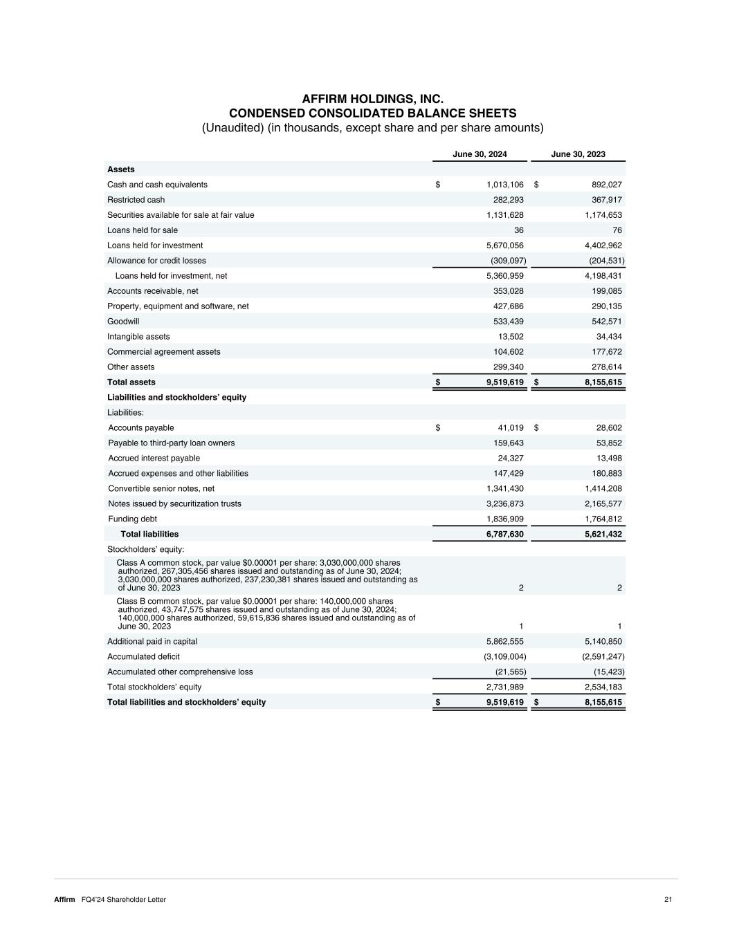 June 30, 2024 June 30, 2023 Assets Cash and cash equivalents $ 1,013,106 $ 892,027 Restricted cash 282,293 367,917 Securities available for sale at fair value 1,131,628 1,174,653 Loans held for sale 36 76 Loans held for investment 5,670,056 4,402,962 Allowance for credit losses (309,097) (204,531) Loans held for investment, net 5,360,959 4,198,431 Accounts receivable, net 353,028 199,085 Property, equipment and software, net 427,686 290,135 Goodwill 533,439 542,571 Intangible assets 13,502 34,434 Commercial agreement assets 104,602 177,672 Other assets 299,340 278,614 Total assets $ 9,519,619 $ 8,155,615 Liabilities and stockholders’ equity Liabilities: Accounts payable $ 41,019 $ 28,602 Payable to third-party loan owners 159,643 53,852 Accrued interest payable 24,327 13,498 Accrued expenses and other liabilities 147,429 180,883 Convertible senior notes, net 1,341,430 1,414,208 Notes issued by securitization trusts 3,236,873 2,165,577 Funding debt 1,836,909 1,764,812 Total liabilities 6,787,630 5,621,432 Stockholders’ equity: Class A common stock, par value $0.00001 per share: 3,030,000,000 shares authorized, 267,305,456 shares issued and outstanding as of June 30, 2024; 3,030,000,000 shares authorized, 237,230,381 shares issued and outstanding as of June 30, 2023 2 2 Class B common stock, par value $0.00001 per share: 140,000,000 shares authorized, 43,747,575 shares issued and outstanding as of June 30, 2024; 140,000,000 shares authorized, 59,615,836 shares issued and outstanding as of June 30, 2023 1 1 Additional paid in capital 5,862,555 5,140,850 Accumulated deficit (3,109,004) (2,591,247) Accumulated other comprehensive loss (21,565) (15,423) Total stockholders’ equity 2,731,989 2,534,183 Total liabilities and stockholders’ equity $ 9,519,619 $ 8,155,615 AFFIRM HOLDINGS, INC. CONDENSED CONSOLIDATED BALANCE SHEETS (Unaudited) (in thousands, except share and per share amounts) 21Affirm FQ4’24 Shareholder Letter