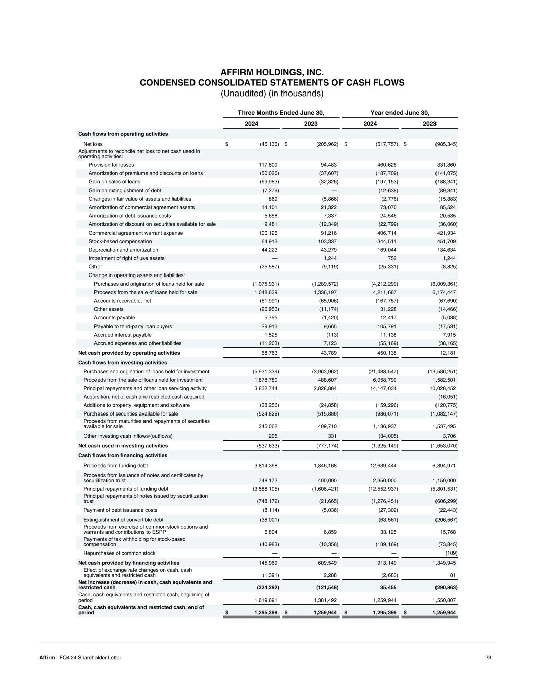 AFFIRM HOLDINGS, INC. CONDENSED CONSOLIDATED STATEMENTS OF CASH FLOWS (Unaudited) (in thousands) Three Months Ended June 30, Year ended June 30, 2024 2023 2024 2023 Cash flows from operating activities Net loss $ (45,136) $ (205,962) $ (517,757) $ (985,345) Adjustments to reconcile net loss to net cash used in operating activities: Provision for losses 117,609 94,483 460,628 331,860 Amortization of premiums and discounts on loans (50,026) (37,607) (187,709) (141,075) Gain on sales of loans (69,983) (32,326) (197,153) (188,341) Gain on extinguishment of debt (7,279) — (12,638) (89,841) Changes in fair value of assets and liabilities 869 (5,866) (2,776) (15,883) Amortization of commercial agreement assets 14,101 21,322 73,070 85,524 Amortization of debt issuance costs 5,658 7,337 24,546 20,535 Amortization of discount on securities available for sale 9,481 (12,349) (22,799) (36,060) Commercial agreement warrant expense 100,126 91,216 406,714 421,934 Stock-based compensation 64,913 103,337 344,511 451,709 Depreciation and amortization 44,223 43,279 169,044 134,634 Impairment of right of use assets — 1,244 752 1,244 Other (25,587) (9,119) (25,331) (8,825) Change in operating assets and liabilities: Purchases and origination of loans held for sale (1,075,931) (1,289,572) (4,212,299) (6,009,361) Proceeds from the sale of loans held for sale 1,048,639 1,336,197 4,211,687 6,174,447 Accounts receivable, net (61,991) (65,906) (167,757) (67,690) Other assets (26,953) (11,174) 31,228 (14,466) Accounts payable 5,795 (1,420) 12,417 (5,038) Payable to third-party loan buyers 29,913 9,665 105,791 (17,531) Accrued interest payable 1,525 (113) 11,138 7,915 Accrued expenses and other liabilities (11,203) 7,123 (55,169) (38,165) Net cash provided by operating activities 68,763 43,789 450,138 12,181 Cash flows from investing activities Purchases and origination of loans held for investment (5,931,339) (3,963,962) (21,488,547) (13,586,251) Proceeds from the sale of loans held for investment 1,878,780 488,607 6,058,799 1,582,501 Principal repayments and other loan servicing activity 3,832,744 2,828,884 14,147,034 10,028,452 Acquisition, net of cash and restricted cash acquired — — — (16,051) Additions to property, equipment and software (38,256) (24,858) (159,296) (120,775) Purchases of securities available for sale (524,829) (515,886) (986,071) (1,082,147) Proceeds from maturities and repayments of securities available for sale 245,062 409,710 1,136,937 1,537,495 Other investing cash inflows/(outflows) 205 331 (34,005) 3,706 Net cash used in investing activities (537,633) (777,174) (1,325,149) (1,653,070) Cash flows from financing activities Proceeds from funding debt 3,814,368 1,846,168 12,639,444 6,894,971 Proceeds from issuance of notes and certificates by securitization trust 748,172 400,000 2,350,000 1,150,000 Principal repayments of funding debt (3,588,105) (1,606,421) (12,552,937) (5,801,531) Principal repayments of notes issued by securitization trust (748,172) (21,665) (1,276,451) (606,299) Payment of debt issuance costs (8,114) (5,036) (27,302) (22,443) Extinguishment of convertible debt (38,001) — (63,561) (206,567) Proceeds from exercise of common stock options and warrants and contributions to ESPP 6,804 6,859 33,125 15,768 Payments of tax withholding for stock-based compensation (40,983) (10,356) (189,169) (73,845) Repurchases of common stock — — — (109) Net cash provided by financing activities 145,969 609,549 913,149 1,349,945 Effect of exchange rate changes on cash, cash equivalents and restricted cash (1,391) 2,288 (2,683) 81 Net increase (decrease) in cash, cash equivalents and restricted cash (324,292) (121,548) 35,455 (290,863) Cash, cash equivalents and restricted cash, beginning of period 1,619,691 1,381,492 1,259,944 1,550,807 Cash, cash equivalents and restricted cash, end of period $ 1,295,399 $ 1,259,944 $ 1,295,399 $ 1,259,944 23Affirm FQ4’24 Shareholder Letter