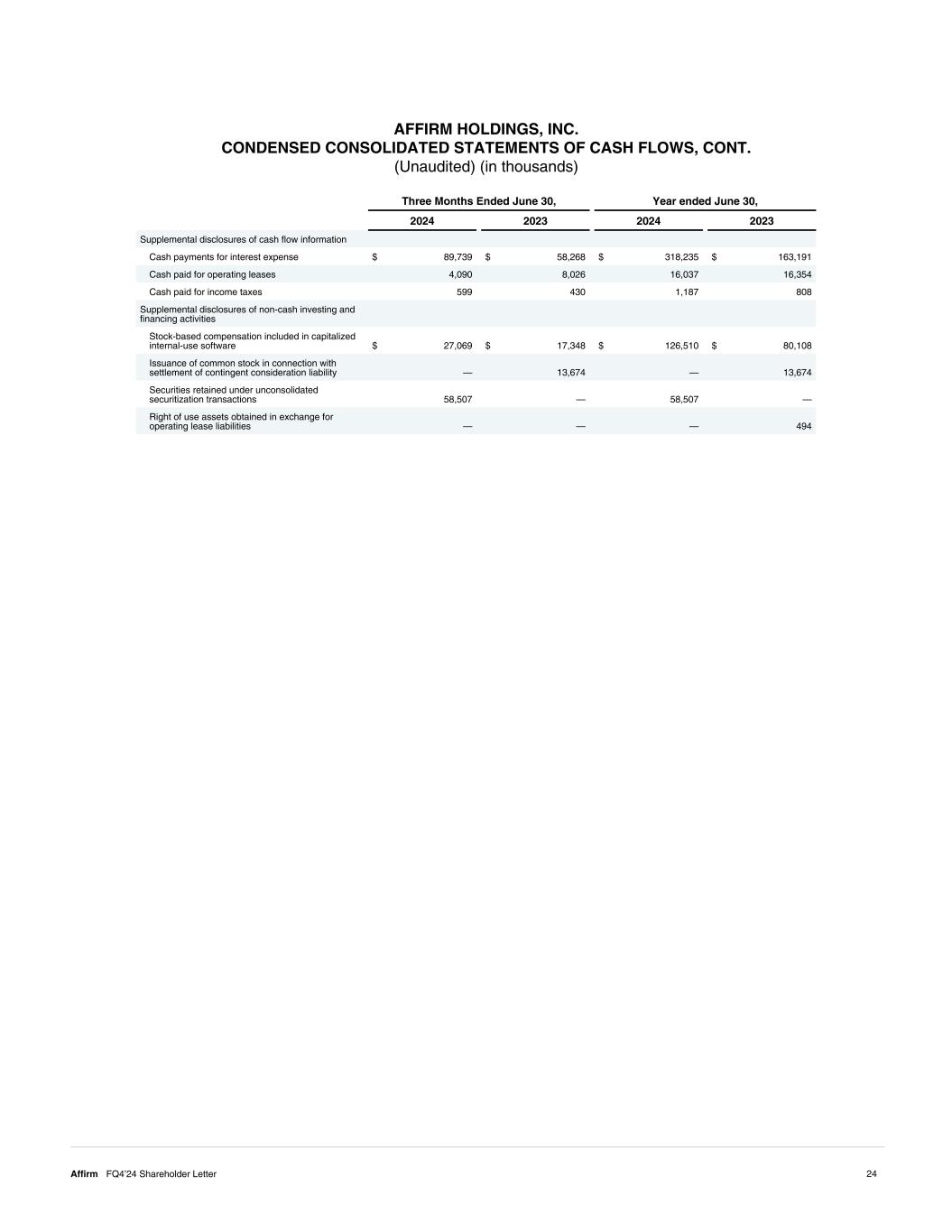 AFFIRM HOLDINGS, INC. CONDENSED CONSOLIDATED STATEMENTS OF CASH FLOWS, CONT. (Unaudited) (in thousands) Three Months Ended June 30, Year ended June 30, 2024 2023 2024 2023 Supplemental disclosures of cash flow information Cash payments for interest expense $ 89,739 $ 58,268 $ 318,235 $ 163,191 Cash paid for operating leases 4,090 8,026 16,037 16,354 Cash paid for income taxes 599 430 1,187 808 Supplemental disclosures of non-cash investing and financing activities Stock-based compensation included in capitalized internal-use software $ 27,069 $ 17,348 $ 126,510 $ 80,108 Issuance of common stock in connection with settlement of contingent consideration liability — 13,674 — 13,674 Securities retained under unconsolidated securitization transactions 58,507 — 58,507 — Right of use assets obtained in exchange for operating lease liabilities — — — 494 24Affirm FQ4’24 Shareholder Letter