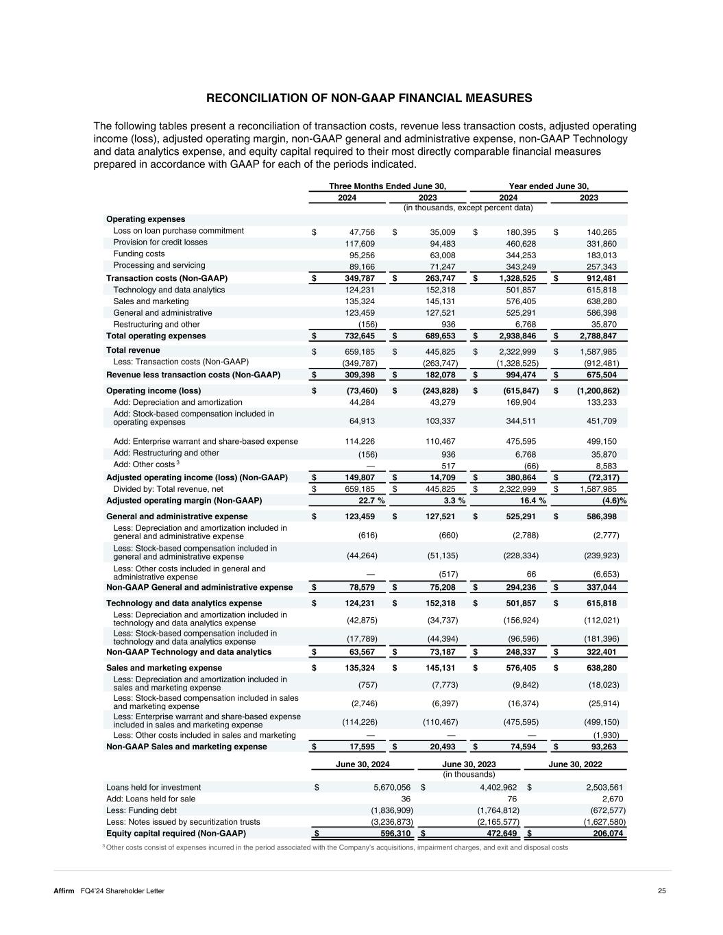 RECONCILIATION OF NON-GAAP FINANCIAL MEASURES The following tables present a reconciliation of transaction costs, revenue less transaction costs, adjusted operating income (loss), adjusted operating margin, non-GAAP general and administrative expense, non-GAAP Technology and data analytics expense, and equity capital required to their most directly comparable financial measures prepared in accordance with GAAP for each of the periods indicated. Three Months Ended June 30, Year ended June 30, 2024 2023 2024 2023 (in thousands, except percent data) Operating expenses Loss on loan purchase commitment $ 47,756 $ 35,009 $ 180,395 $ 140,265 Provision for credit losses 117,609 94,483 460,628 331,860 Funding costs 95,256 63,008 344,253 183,013 Processing and servicing 89,166 71,247 343,249 257,343 Transaction costs (Non-GAAP) $ 349,787 $ 263,747 $ 1,328,525 $ 912,481 Technology and data analytics 124,231 152,318 501,857 615,818 Sales and marketing 135,324 145,131 576,405 638,280 General and administrative 123,459 127,521 525,291 586,398 Restructuring and other (156) 936 6,768 35,870 Total operating expenses $ 732,645 $ 689,653 $ 2,938,846 $ 2,788,847 Total revenue $ 659,185 $ 445,825 $ 2,322,999 $ 1,587,985 Less: Transaction costs (Non-GAAP) (349,787) (263,747) (1,328,525) (912,481) Revenue less transaction costs (Non-GAAP) $ 309,398 $ 182,078 $ 994,474 $ 675,504 Operating income (loss) $ (73,460) $ (243,828) $ (615,847) $ (1,200,862) Add: Depreciation and amortization 44,284 43,279 169,904 133,233 Add: Stock-based compensation included in operating expenses 64,913 103,337 344,511 451,709 Add: Enterprise warrant and share-based expense 114,226 110,467 475,595 499,150 Add: Restructuring and other (156) 936 6,768 35,870 Add: Other costs 3 — 517 (66) 8,583 Adjusted operating income (loss) (Non-GAAP) $ 149,807 $ 14,709 $ 380,864 $ (72,317) Divided by: Total revenue, net $ 659,185 $ 445,825 $ 2,322,999 $ 1,587,985 Adjusted operating margin (Non-GAAP) 22.7 % 3.3 % 16.4 % (4.6) % General and administrative expense $ 123,459 $ 127,521 $ 525,291 $ 586,398 Less: Depreciation and amortization included in general and administrative expense (616) (660) (2,788) (2,777) Less: Stock-based compensation included in general and administrative expense (44,264) (51,135) (228,334) (239,923) Less: Other costs included in general and administrative expense — (517) 66 (6,653) Non-GAAP General and administrative expense $ 78,579 $ 75,208 $ 294,236 $ 337,044 Technology and data analytics expense $ 124,231 $ 152,318 $ 501,857 $ 615,818 Less: Depreciation and amortization included in technology and data analytics expense (42,875) (34,737) (156,924) (112,021) Less: Stock-based compensation included in technology and data analytics expense (17,789) (44,394) (96,596) (181,396) Non-GAAP Technology and data analytics expense $ 63,567 $ 73,187 $ 248,337 $ 322,401 Sales and marketing expense $ 135,324 $ 145,131 $ 576,405 $ 638,280 Less: Depreciation and amortization included in sales and marketing expense (757) (7,773) (9,842) (18,023) Less: Stock-based compensation included in sales and marketing expense (2,746) (6,397) (16,374) (25,914) Less: Enterprise warrant and share-based expense included in sales and marketing expense (114,226) (110,467) (475,595) (499,150) Less: Other costs included in sales and marketing expense — — — (1,930) Non-GAAP Sales and marketing expense $ 17,595 $ 20,493 $ 74,594 $ 93,263 June 30, 2024 June 30, 2023 June 30, 2022 (in thousands) Loans held for investment $ 5,670,056 $ 4,402,962 $ 2,503,561 Add: Loans held for sale 36 76 2,670 Less: Funding debt (1,836,909) (1,764,812) (672,577) Less: Notes issued by securitization trusts (3,236,873) (2,165,577) (1,627,580) Equity capital required (Non-GAAP) $ 596,310 $ 472,649 $ 206,074 3 Other costs consist of expenses incurred in the period associated with the Company’s acquisitions, impairment charges, and exit and disposal costs 25Affirm FQ4’24 Shareholder Letter