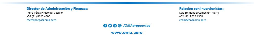 El presente comunicado puede contener información y declaraciones en tiempo futuro. Las declaraciones en tiempo futuro no constituyen hechos históricos. Estas declaraciones son únicamente predicciones basadas en información conocida por la compañía hasta el momento y en nuestras expectativas y proyecciones con respecto a eventos futuros. Las declaraciones en tiempo futuro pueden ser identificadas con las palabras “considerar”, “esperar”, “anticipar”, “dirigir”, “estimar” o expresiones similares. A pesar de que la administración de OMA considera que las expectativas reflejadas en dichas declaraciones en tiempo futuro son razonables, se hace del conocimiento de los inversionistas que la información y declaraciones en tiempo futuro están sujetas a distintos riesgos y eventos inciertos, los cuales son difíciles de predecir y se encuentran generalmente fuera del control de OMA, y pudieran provocar que los resultados y el desempeño reales difieran sustancialmente de aquellos expresados en el presente comunicado. Estos riesgos y eventos inciertos incluyen, sin limitación, aquellos incluidos en nuestro Reporte Anual bajo el rubro “Factores de Riesgo”. OMA no asume responsabilidad alguna en cuanto a la actualización pública de sus declaraciones o información en tiempo futuro, ya sea como resultado de nueva información, eventos futuros o cualquier otra circunstancia.