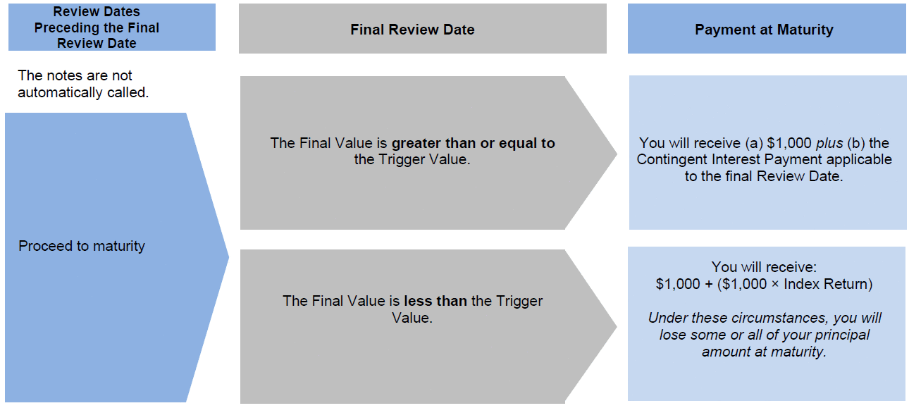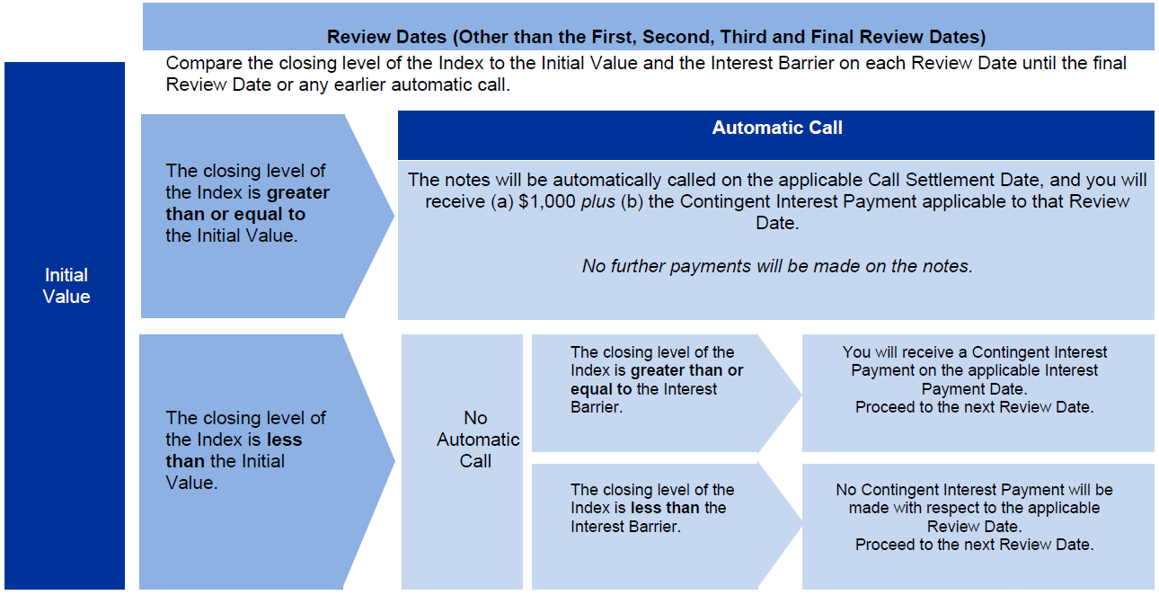 Automatic Call: If the closing level of the Index on any Review Date (other than the first, second, third and final Review Dates) is greater than or equal to the Initial Value, the notes will be automatically called for a cash payment, for each $1,000 principal amount note, equal to (a) $1,000 plus (b) the Contingent Interest Payment applicable to that Review Date, payable on the applicable Call Settlement Date. No further payments will be made on the notes. Payment at Maturity: If the notes have not been automatically called and the Final Value is greater than or equal to the Trigger Value, you will receive a cash payment at maturity, for each $1,000 principal amount note, equal to (a) $1,000 plus (b) the Contingent Interest Payment applicable to the final Review Date. If the notes have not been automatically called and the Final Value is less than the Trigger Value, your payment at maturity per $1,000 principal amount note will be calculated as follows: $1,000 + ($1,000 × Index Return) If the notes have not been automatically called and the Final Value is less than the Trigger Value, you will lose more than 50.00% of your principal amount at maturity and could lose all of your principal amount at maturity. Index Return: (Final Value – Initial Value) Initial Value: The closing level of the Index on the Pricing Date Final Value: The closing level of the Index on the final Review Date